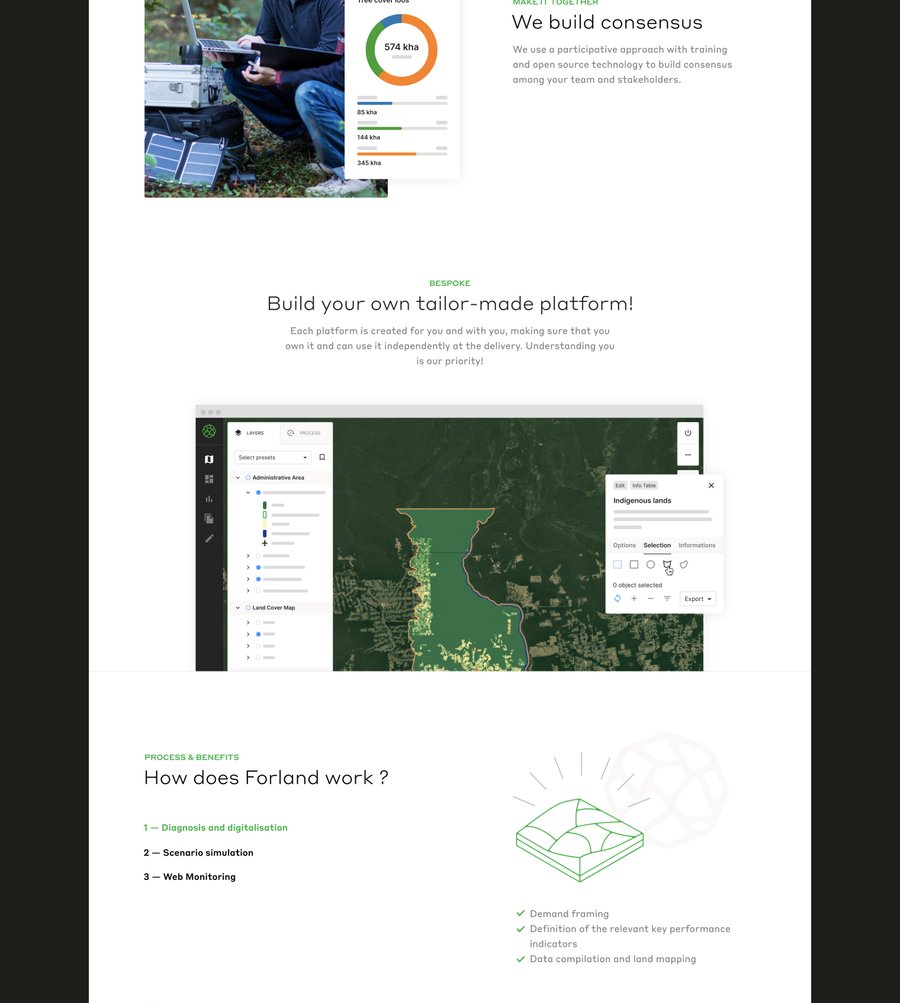 Forland is an online platform powered by ONFI, displaying real time visualisation of landscape with a set of on-demand features to test land-use management decision impacts in the short-to-long term.