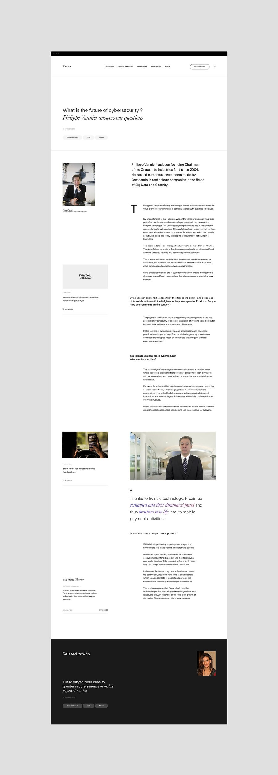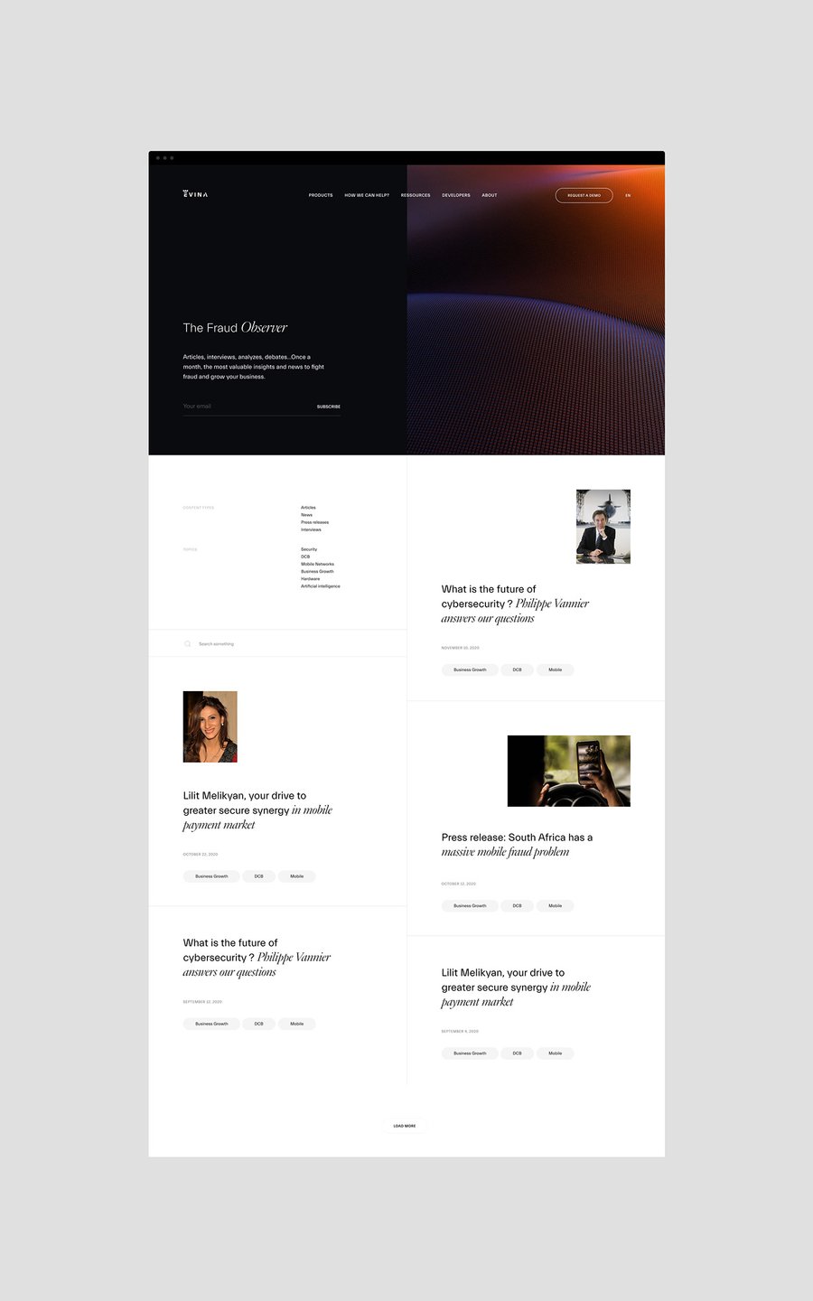 In addition to fraud analysis tools and services, Evina hosts an editorial platform, the Fraud Observer providing insights, interviews and news.