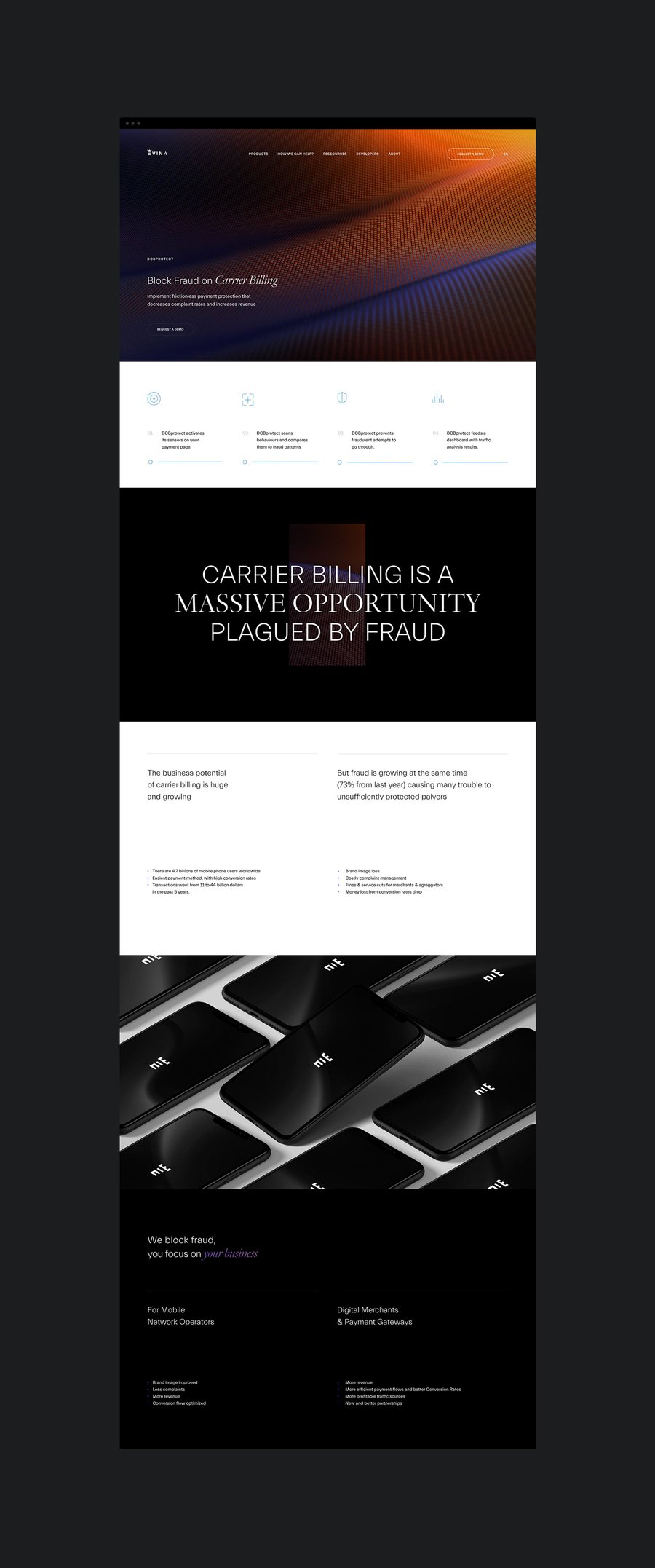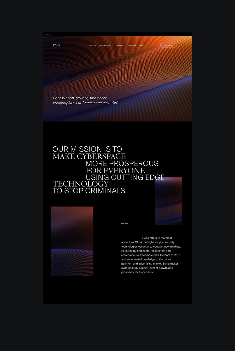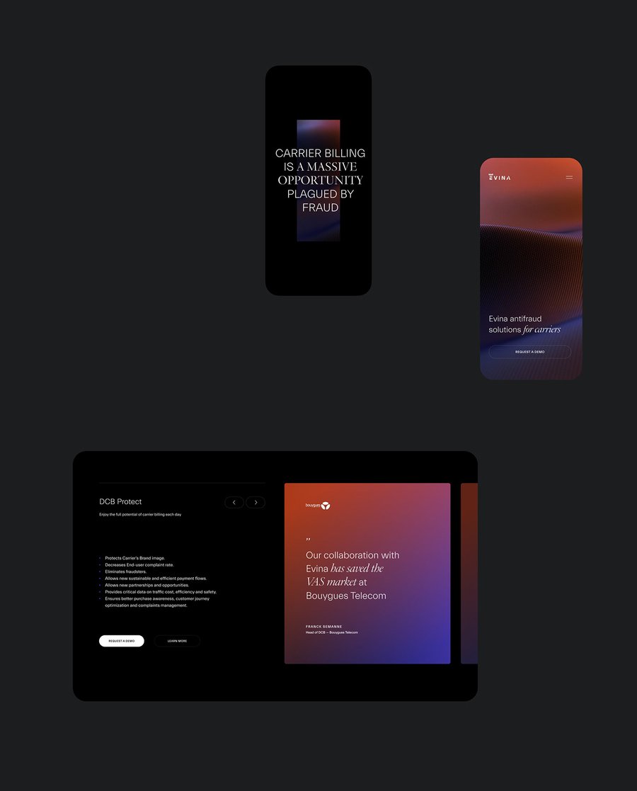 Leader in cyber security for phone carriers, Evina offers a suite of tools and services at the cutting edge of innovation to identify and track large-scale fraud operations on mobile networks. In collaboration with their team, we created a new presence unifying the entire brand voice on all of touch points, elevating the visual style in a bold and colorful art direction.