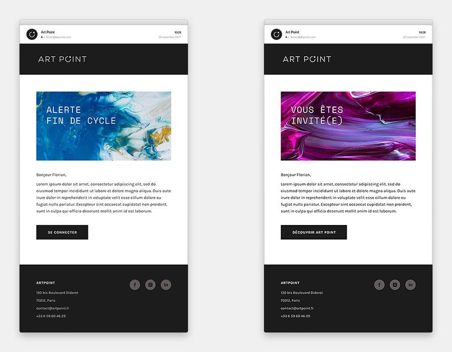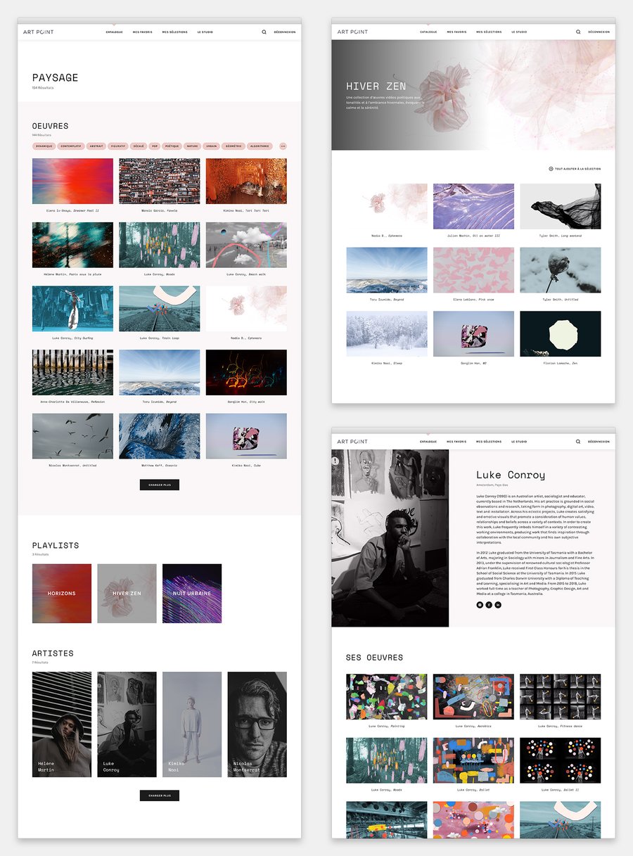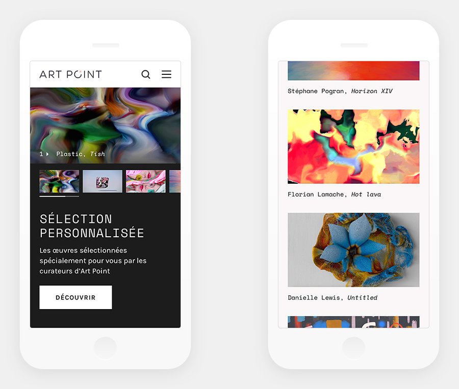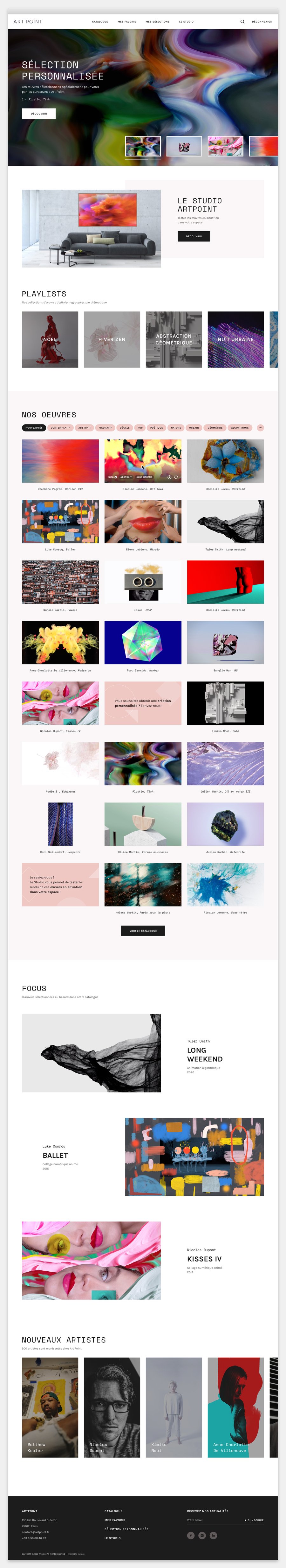 Artpoint est une galerie d’œuvres d’art numériques affichables sur écran, à destination des lieux fréquentés par le public : bureaux, hôtels, boutiques, etc. J’ai été sollicitée pour assurer la direction artistique de la plateforme qui recense les œuvres de plus de 200 artistes contemporains. L’objectif : valoriser le catalogue d’œuvres numériques à l’aide d’une interface minimaliste et intuitive. Le choix de couleur neutres met en lumière les œuvres et l’emploi d’une police monospace permet d’ancrer la galerie dans l’univers digital.