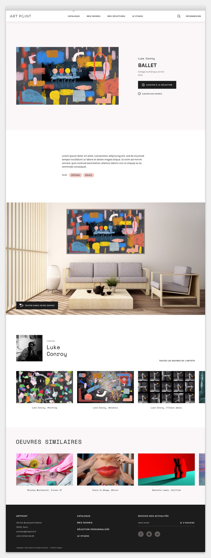 À noter : les titres des œuvres ainsi que les noms et les portraits des artistes ne m’ont pas été fournis au moment de la réalisation des maquettes. Ceux-ci sont donc pour la plupart fictifs sur les écrans qui suivent.