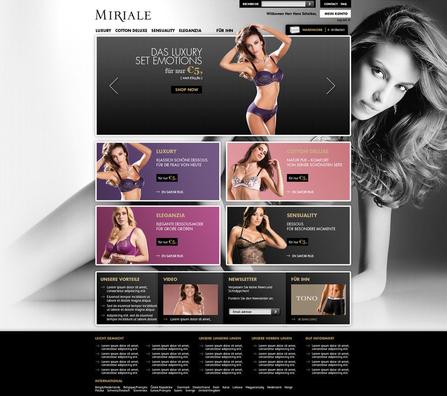 Direction artistique web : créa + déclinaison de l'ensemble des pages du site de la marque Miriale, site décliné sur 15 pays et pour lesquels j'ai également été en charge de l'intégration réalisée en html 5.