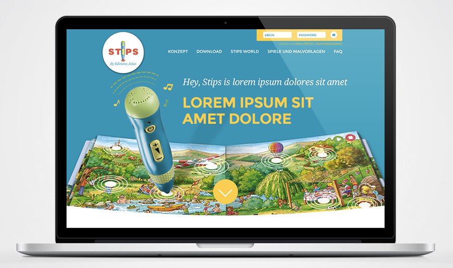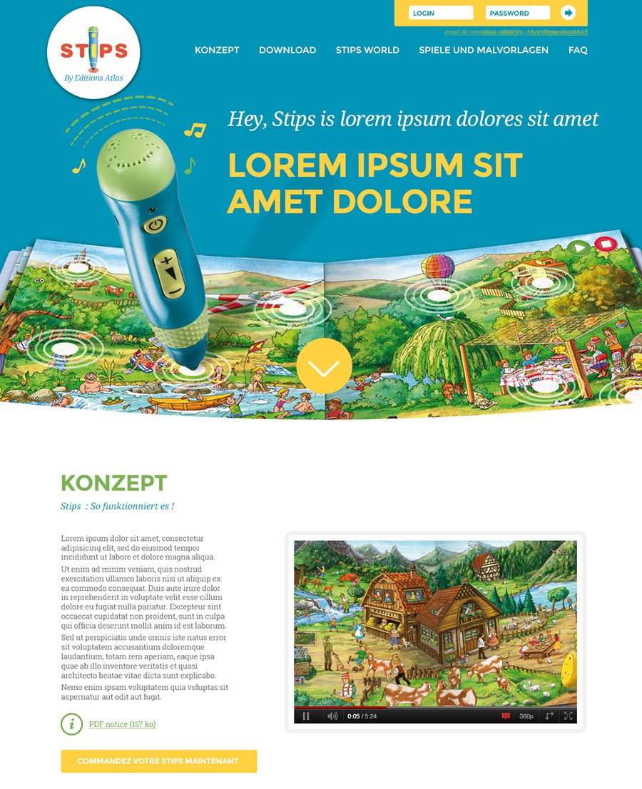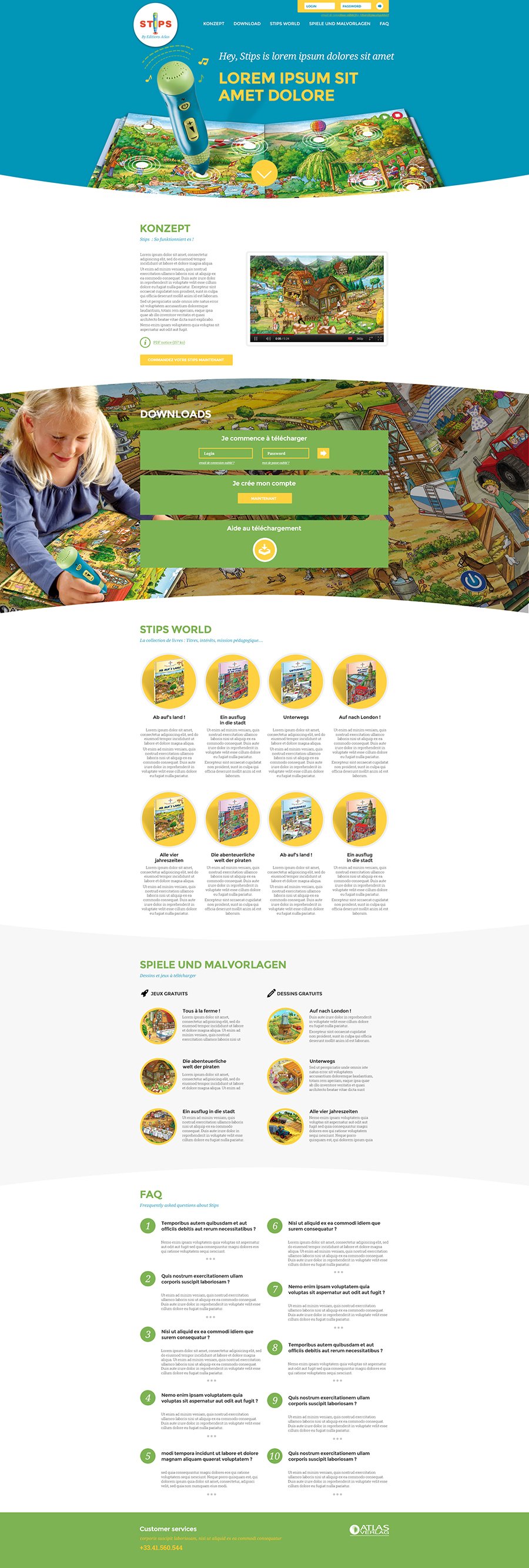 Direction artistique web d'un site produit : "Stips" by Editions Atlas.Réalisation montée en One single page avec effet parallaxe.