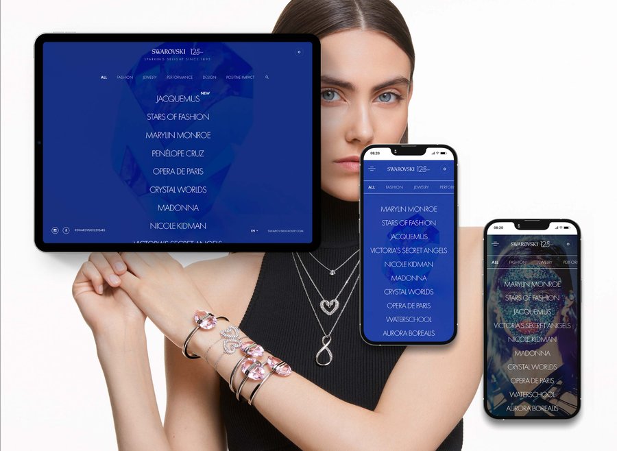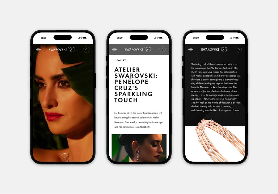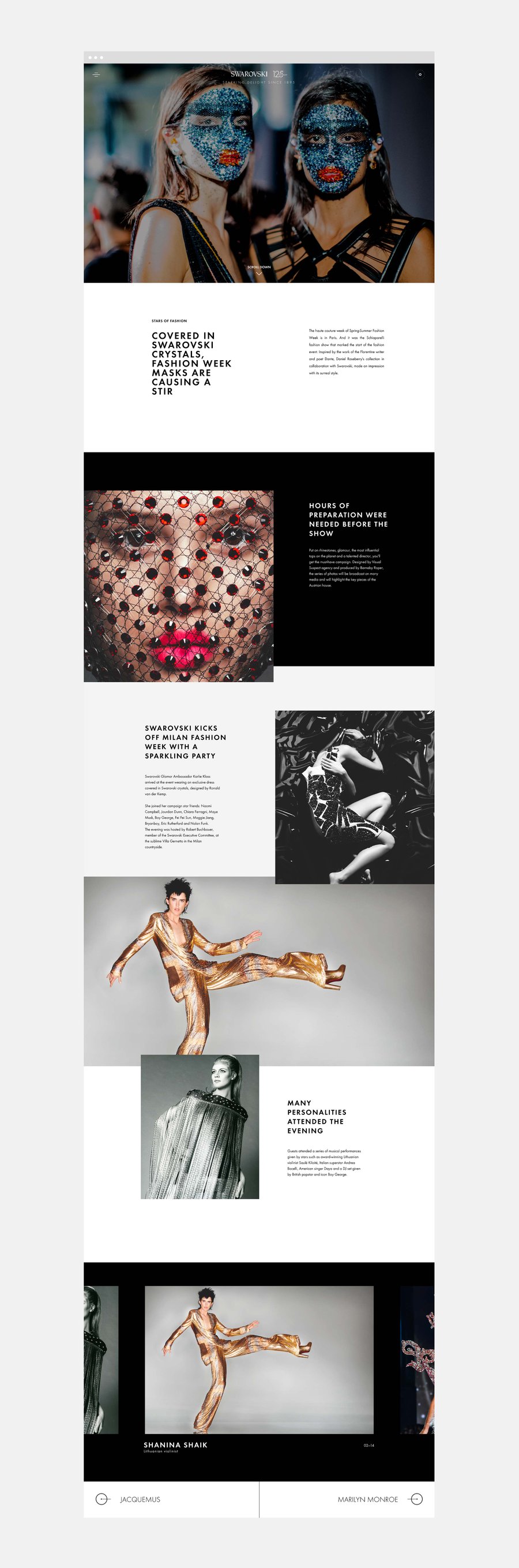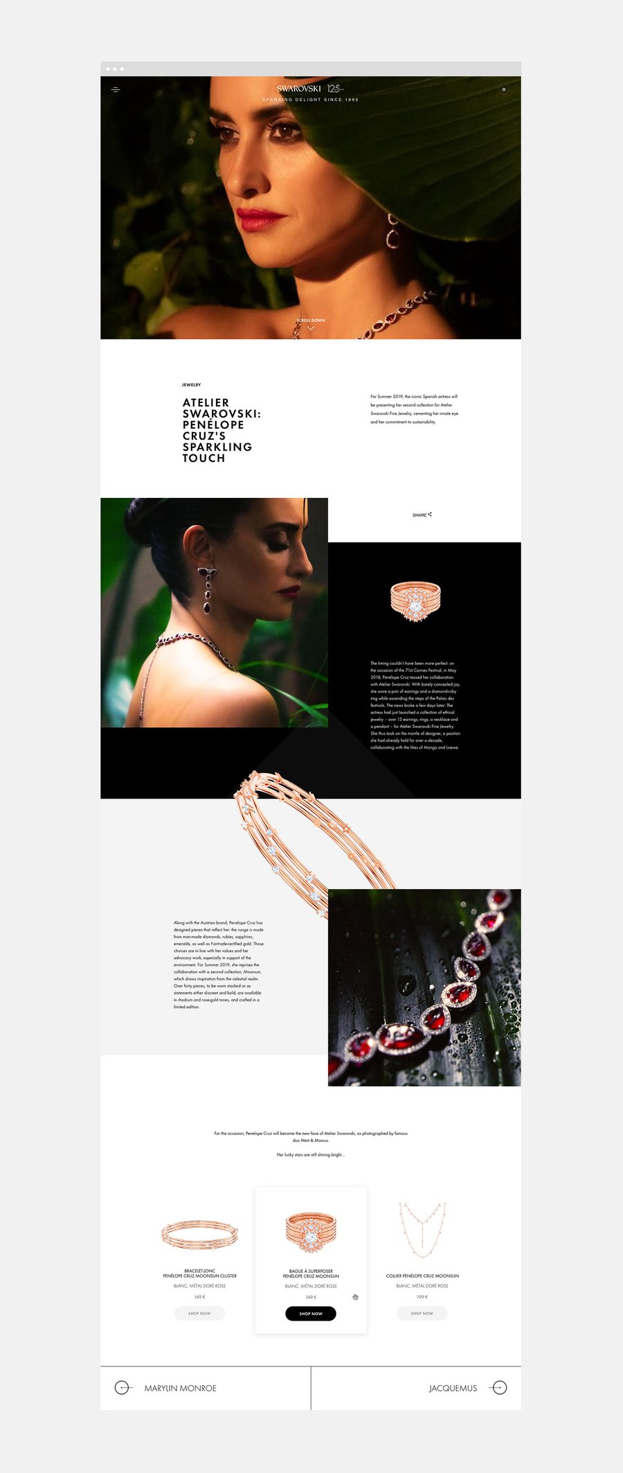 Swarovski is an Austrian producer of crystal glass, jewelry, and accessories. In collaboration with Publicis Luxe, we worked on the creation of an innovative digital platform to celebrate the brand's 125th anniversary, which highlights the key facts and history of the brand. The concept took users on a journey through a 125-faceted crystal, showcasing the brand's collaborations and events with documentaries, interviews, editorial content, and shoppable features. My role was to ensure the art direction, UI design, and prototyping. This project was a tender that we won but was ultimately never produced.