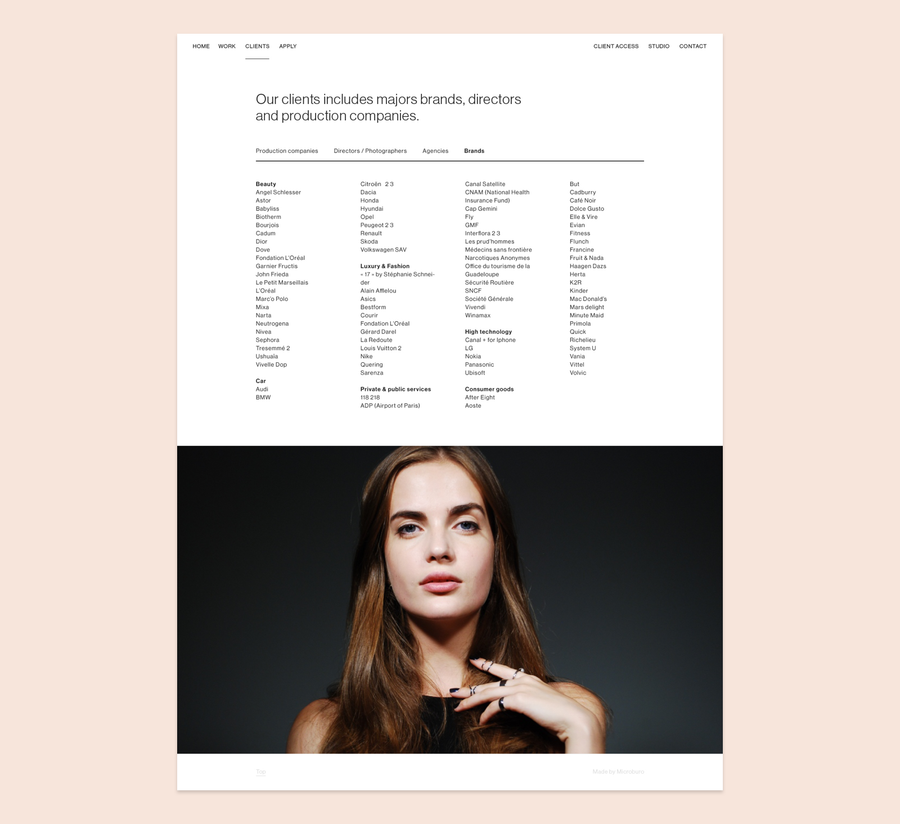 Caporal Films, L/UNIFORM, India Mahdavi, CLM BBDO BEAU, Audi France, LVMH, Audi, State.com, Awdio.com, 404 Prod., Awdio, Hotel Esencia, RSVP Paris, Perrotin, Stouls, Mattia Cielo