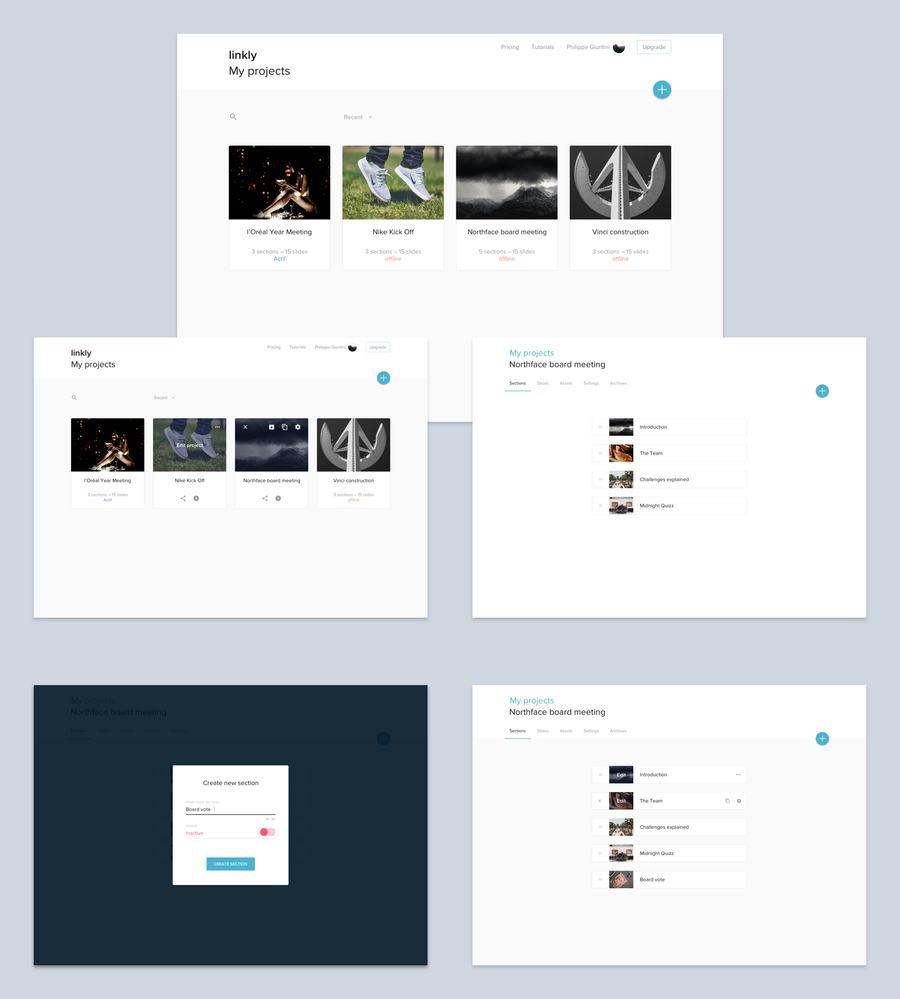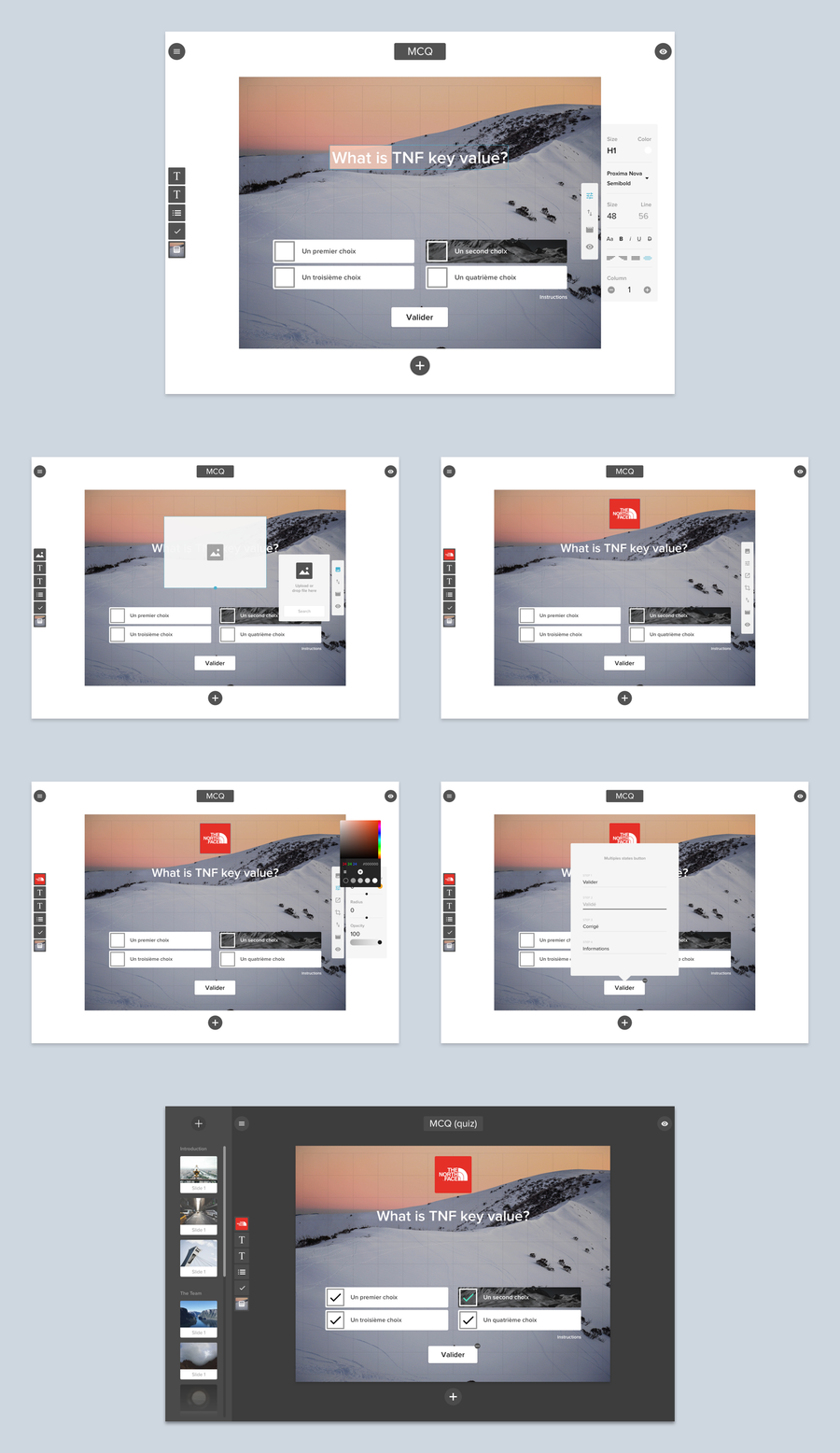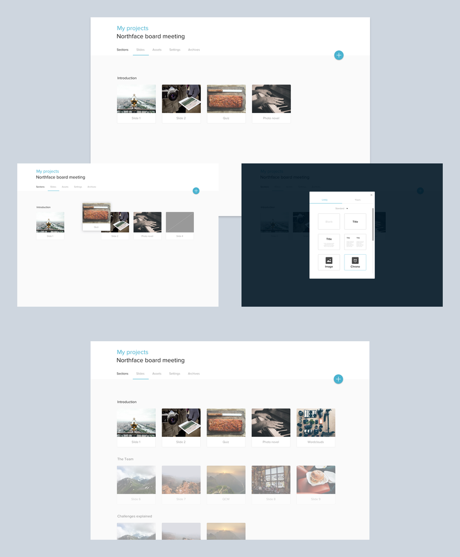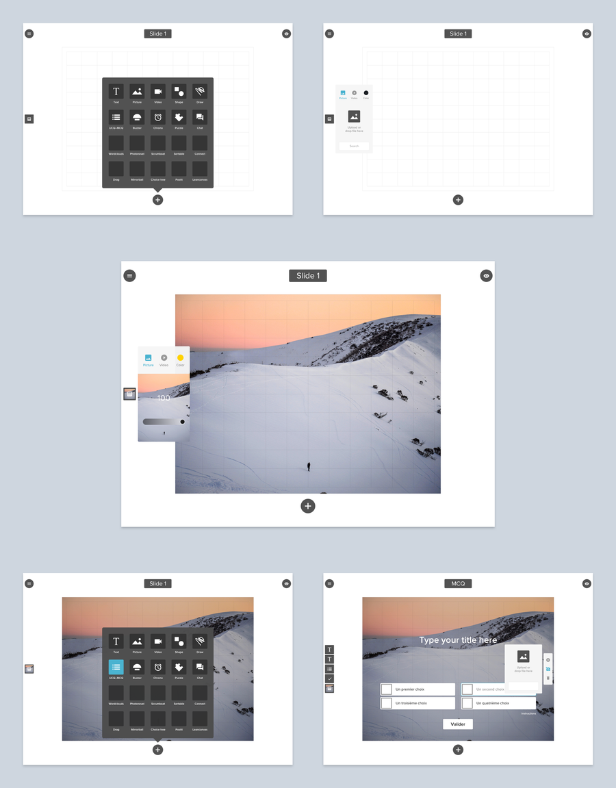 Direction artistique, UI+UX, d'une application iPad de création de présentations, quizz, qcm, vote, etc