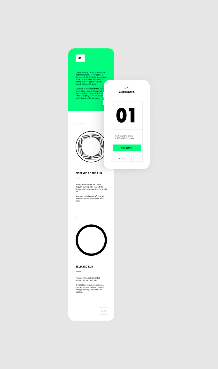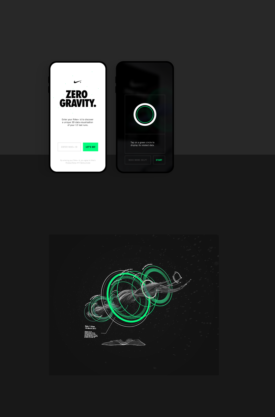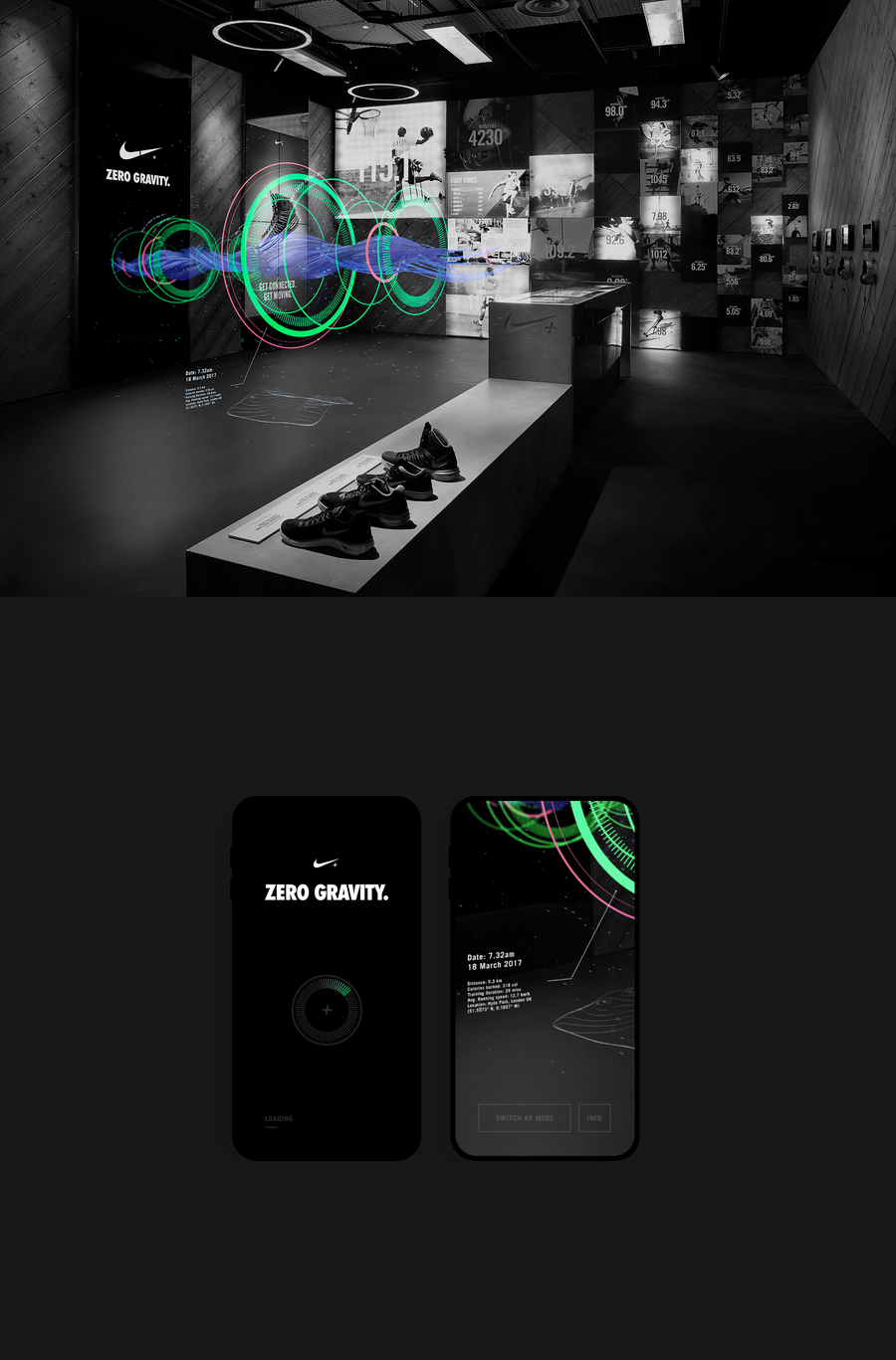 Zero Gravity est une expérience de réalité augmentée à la fois motivationnelle et personnalisée, conçue pour les utilisateurs de Nike+. En scannant une affiche en boutique, chaque coureur pouvait découvrir une visualisation 3D de ses 12 dernières courses, générée à partir de son identifiant Nike+. Le projet visait à créer un pont entre données personnelles, espace physique et inspiration sportive. (note : projet conceptuel commandé par Nike, non réalisé)