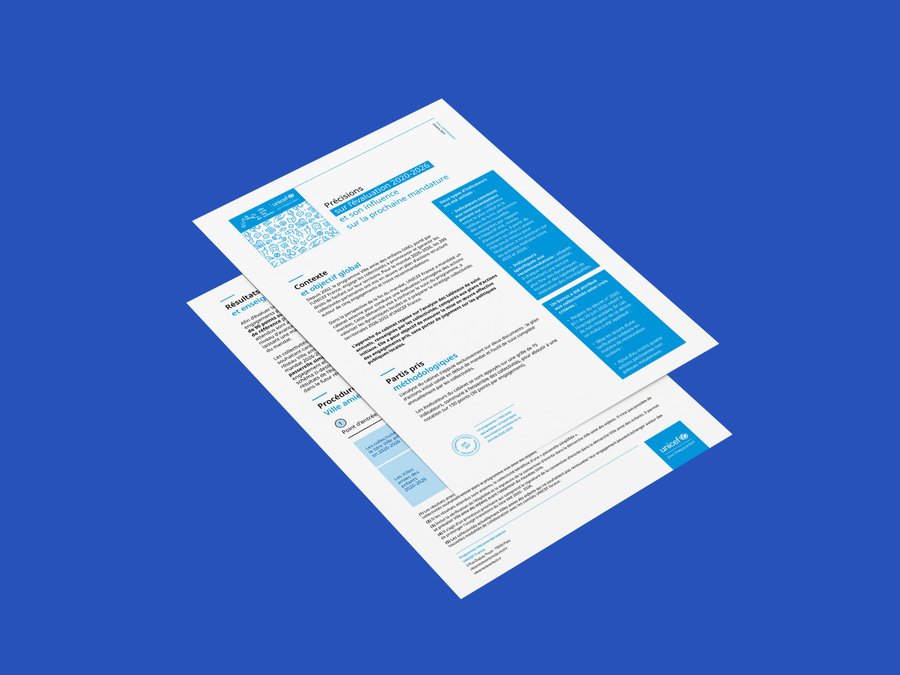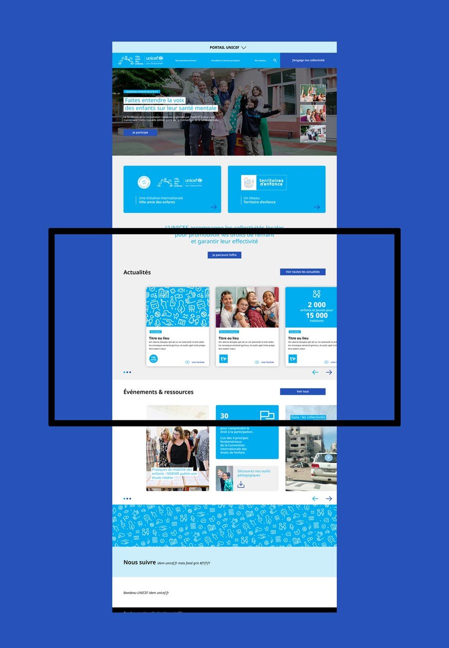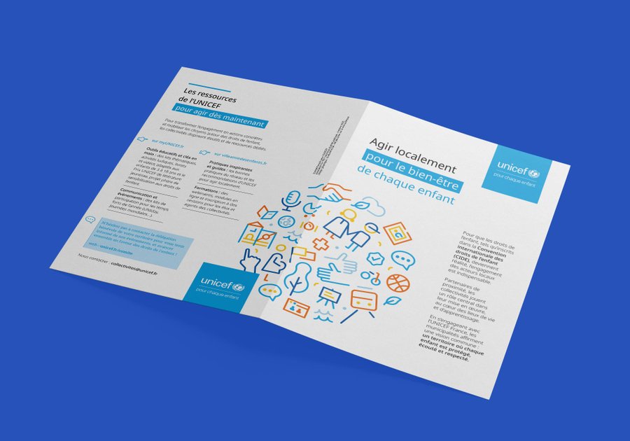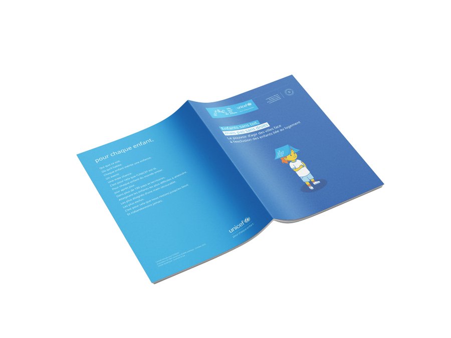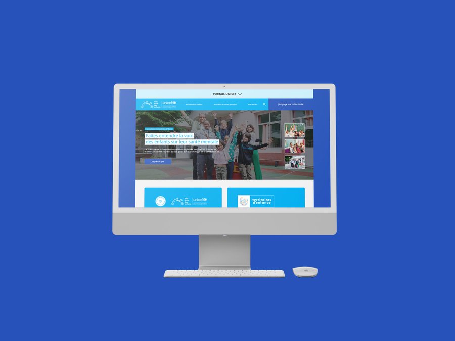 Typographie en minuscules blanches sur fond bleu cyan, directement issue de l'univers UNICEF. Ce choix affirme une identité lisible, accessible, accueillante, à hauteur d'enfant.