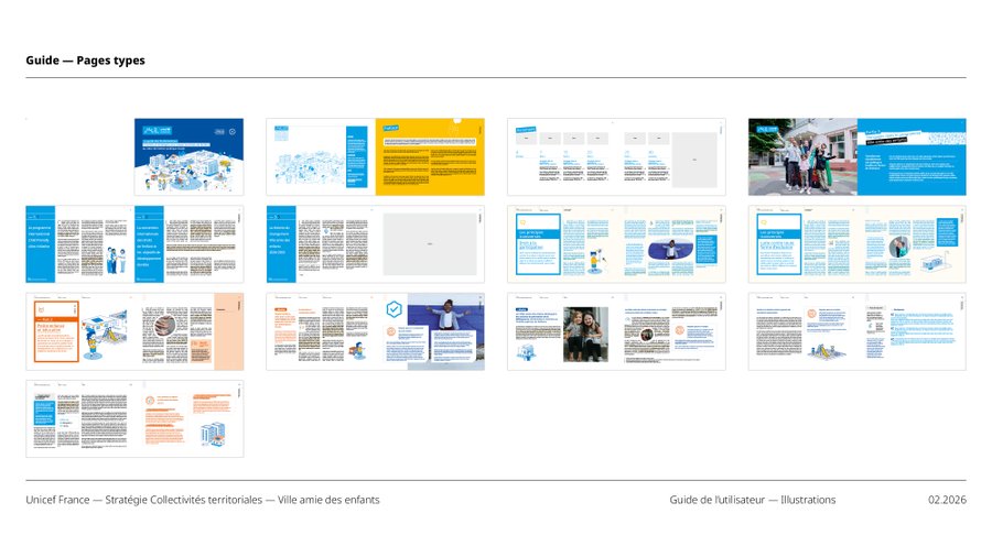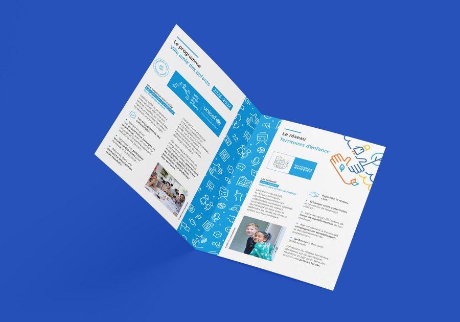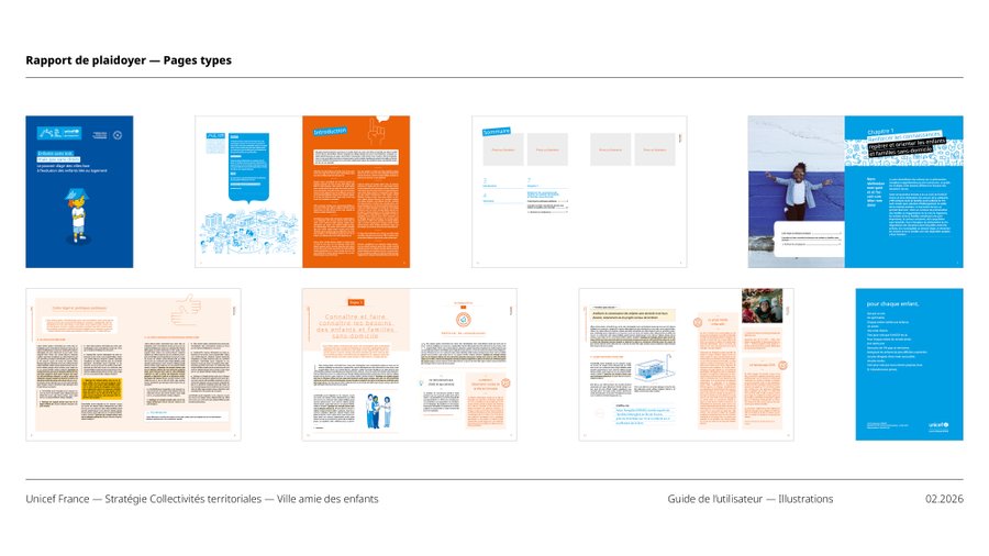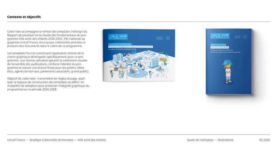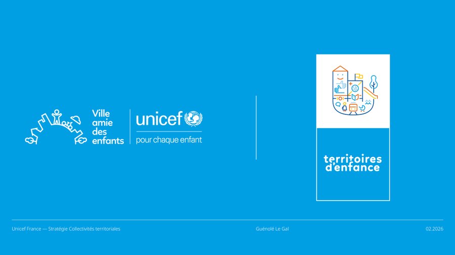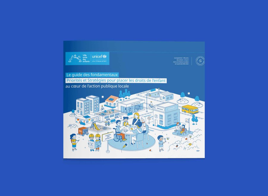 LES IDENTITÉS VILLE AMIE DES ENFANTS ET TERRITOIRES D'ENFANCE ONT ÉTÉ CONÇUES POUR COHABITER HARMONIEUSEMENT TOUT EN AFFIRMANT LEURS SPÉCIFICITÉS. ELLES PARTAGENT DES FONDEMENTS GRAPHIQUES COMMUNS (PALETTE, PRINCIPE DE CARTOUCHE, LANGAGE ICONOGRAPHIQUE ACCESSIBLE) QUI GARANTISSENT LEUR APPARTENANCE À UN MÊME UNIVERS VISUEL INSTITUTIONNEL UNICEF.