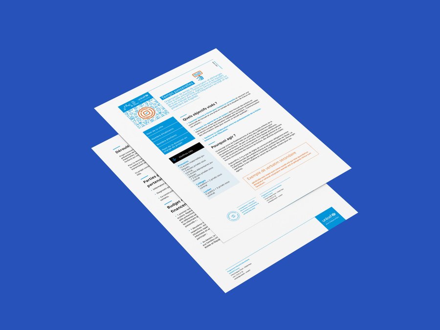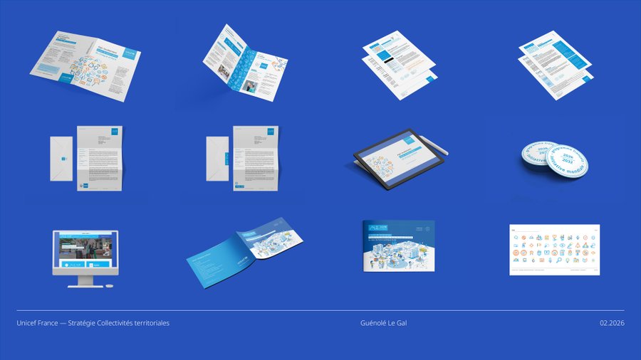 La palette (cyan, outremer, bleu ciel, jaune, orange) renforce la filiation graphique avec la charte UNICEF V4 tout en construisant une identité propre, cohérente et distincte.