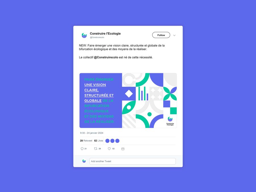 Construire l'écologie est un collectif qui rassemble les professionnels impliqués dans la transformation écologique, partout dans la société : secteur public, privé, syndical, associatif, académique. Le collectif vise à faire émerger une vision claire, structurée et globale de la bifurcation écologique et des moyens de la réaliser. La mission de direction artistique qui m'a été confiée a consisté à créer l'identité visuelle et la charte graphique associée.