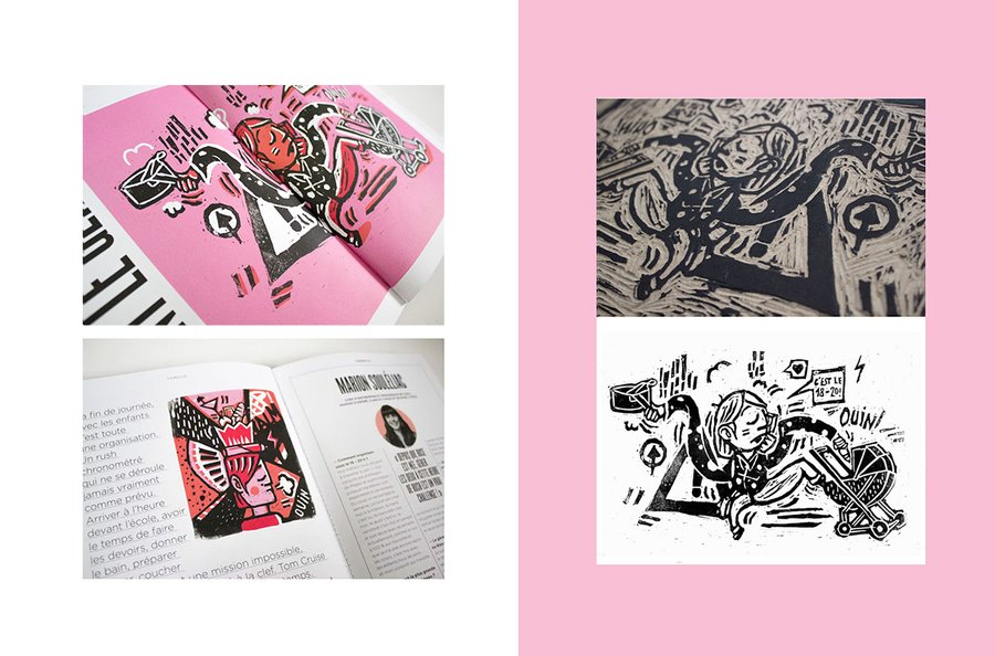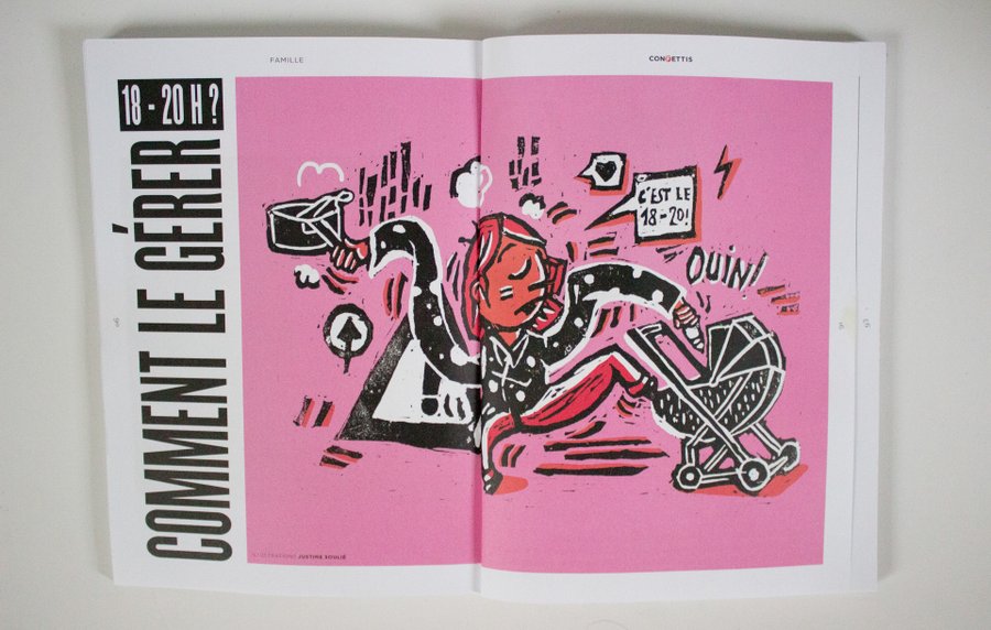 Une agence créative s'aventure dans un nouveau magazine explorant des sujets de manière plus intime que sur Internet. Célébrant l'inspiration pour les femmes modernes, il offre des pauses colorées autour de leurs préoccupations. J'ai pris plaisir à créer trois illustrations représentant un moment redouté de la journée pour les mères.
