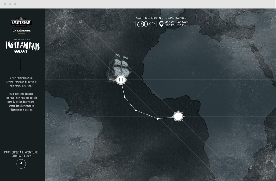 Créer une grande histoire, celle du "Hollandais Volant" qui s'écrira au fur et à mesure par les fans eux-mêmes. Sur le modèle d'un "livre dont vous êtes le héros" et soutenu par un site dédié, la page Facebook devient le lieu de la création de l'histoire de la légende bières Amsterdam.