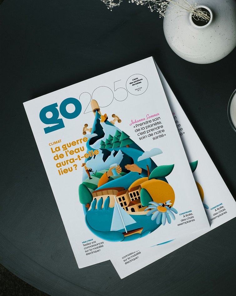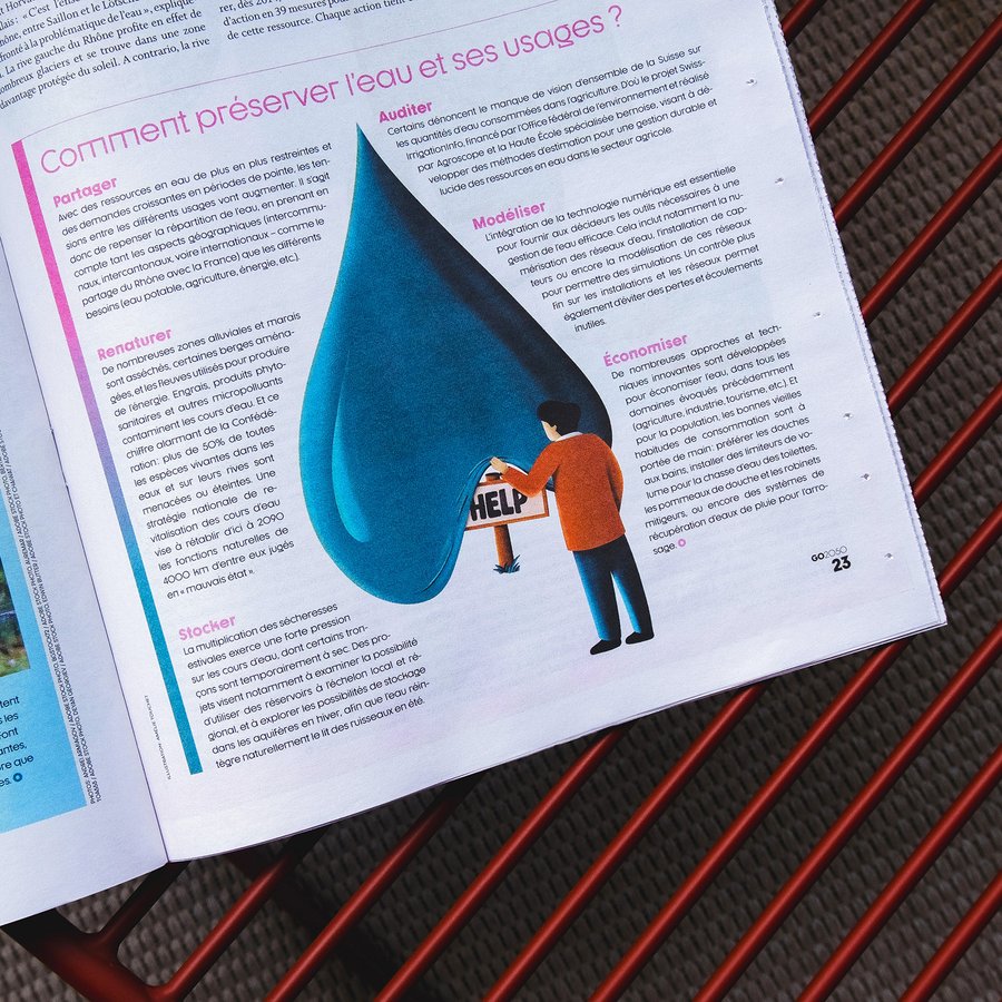 Le magazine trimestriel Go 2050, axé sur les solutions durables, m’a contacté pour illustrer leur troisième édition consacrée à l’eau. J’ai conçu une couverture mettant en valeur le canton du Valais, suivie de trois illustrations inspirées des articles du magazine.