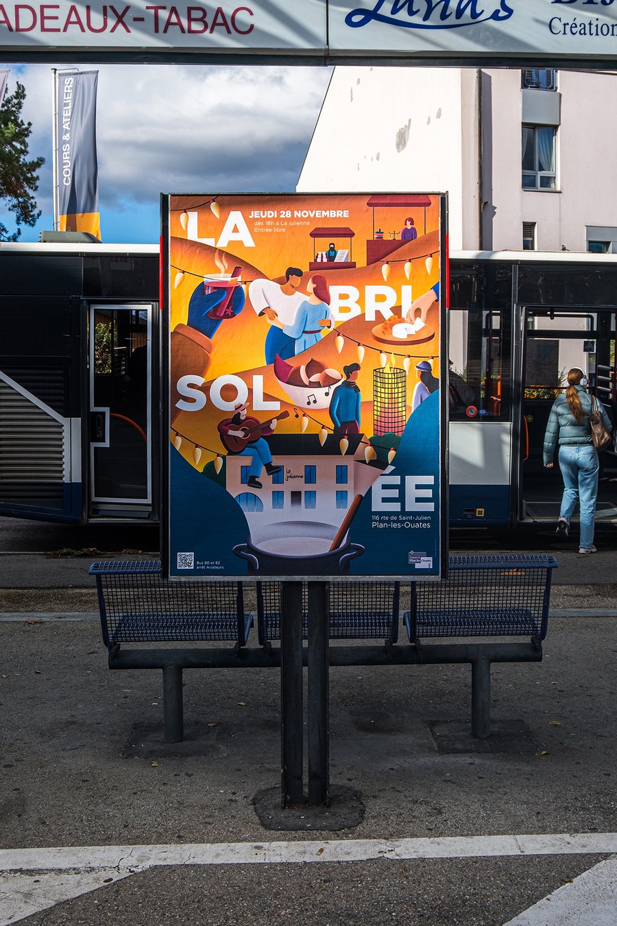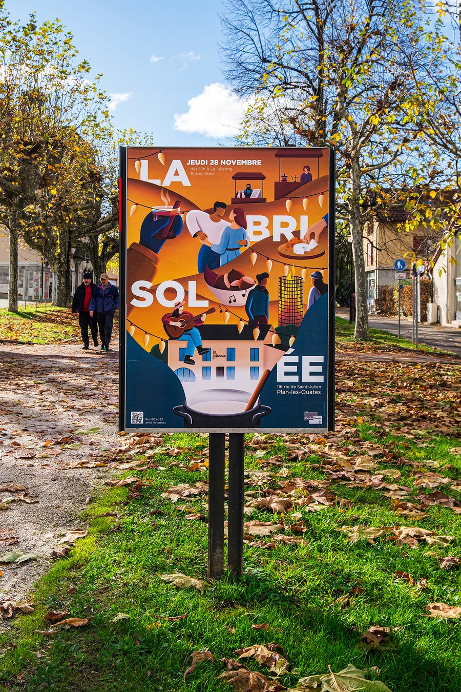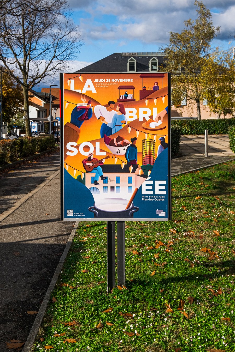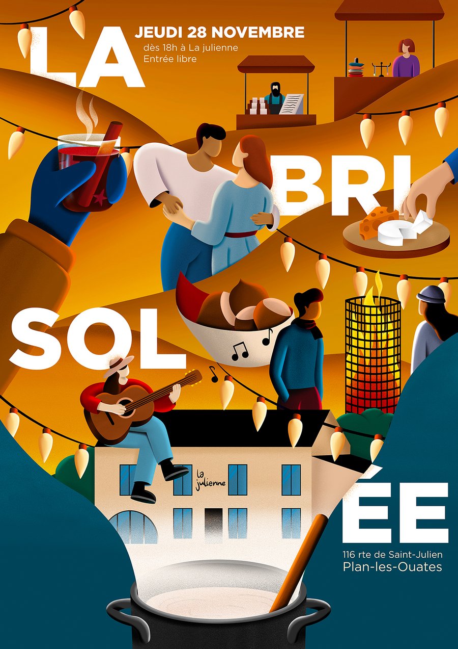 Le Service culturel de la municipalité de Plan-les-Ouates m’a confié la création de l’affiche et du flyer pour leur événement annuel "La Brisolée," organisé à La Julienne, un espace culturel chaleureux et accueillant. J'ai conçu une affiche au format F4 ainsi qu'un flyer, en capturant l'essence automnale et conviviale de cet événement avec des tons de saison.