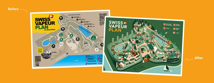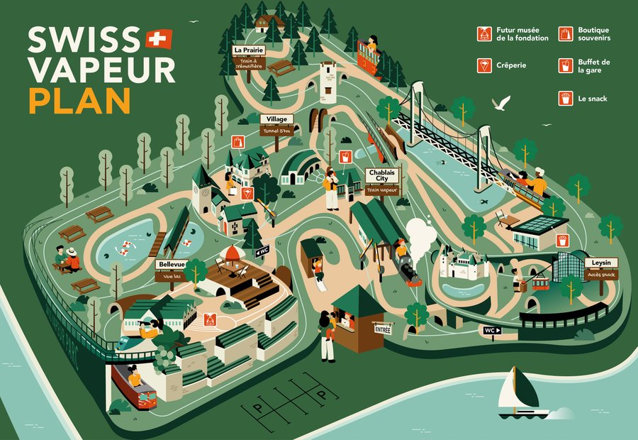 Le parc d'attractions Swiss Vapeur Parc m'a mandaté pour revoir le plan actuel de son parc. Le parc permet de monter à bord de l'une des nombreuses répliques de trains à l'échelle 1/4 et de se laisser transporter à travers le paysage.