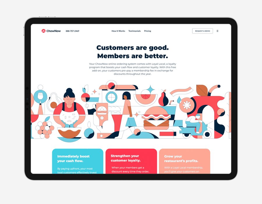 I was commissioned by the team at ChowNow to create their branding illustration kit for the company’s website, app, social media, and more. Together, we developed every concept to portray a visual message that would align with their appropriate marketing strategy.