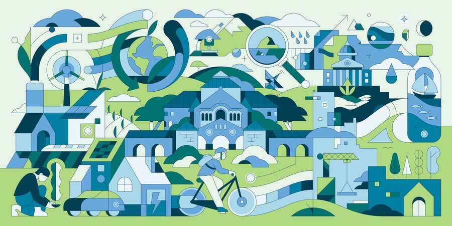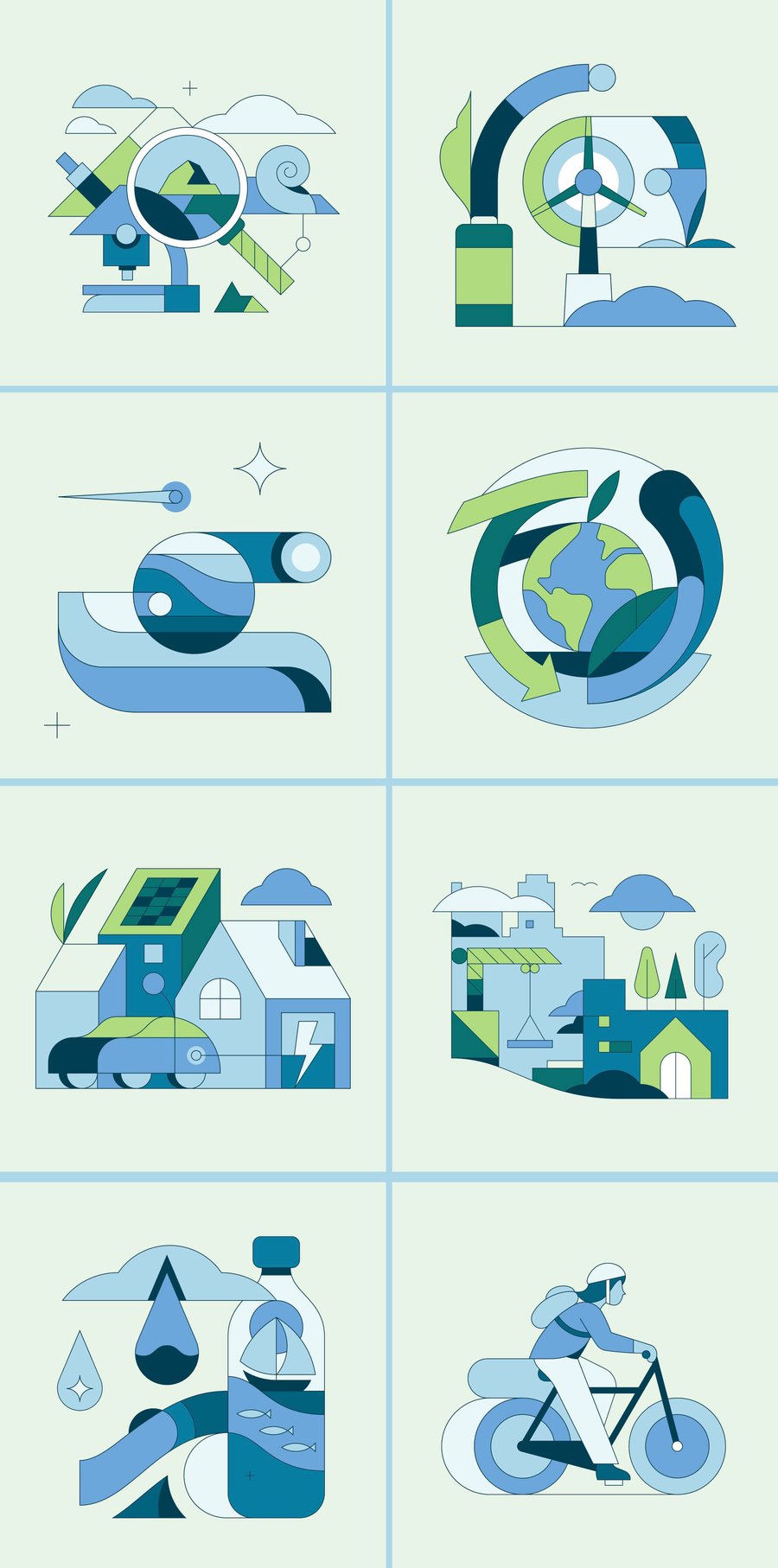 This set of illustrations for Sustainability, highlights energy science and engineering environmental policy.