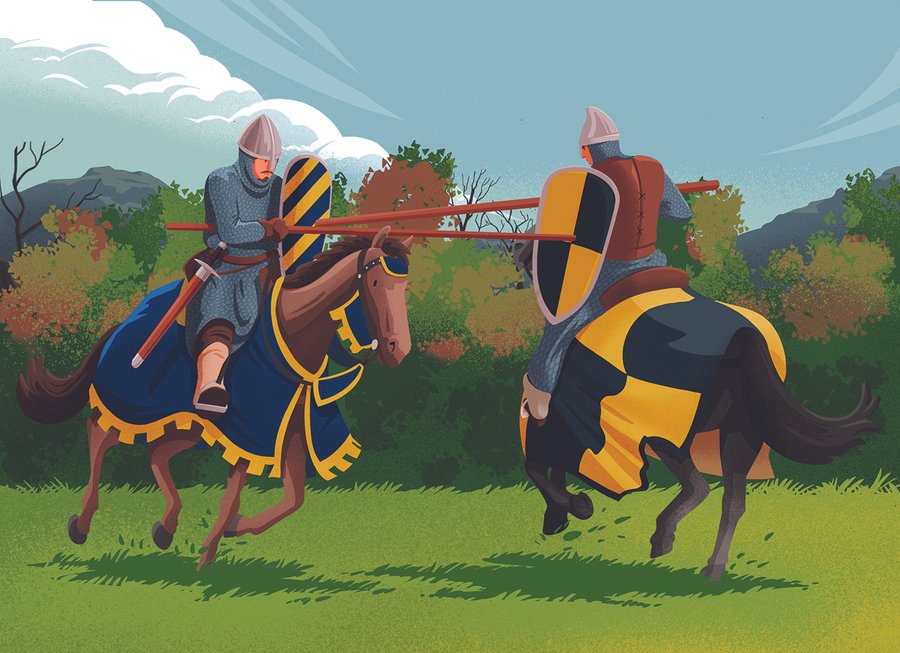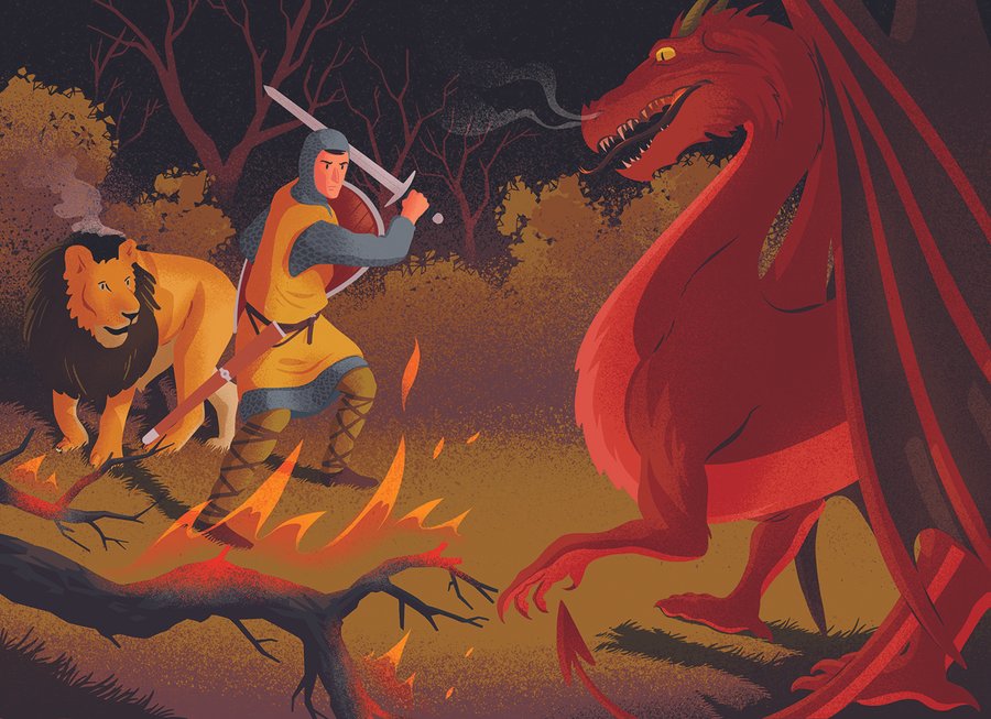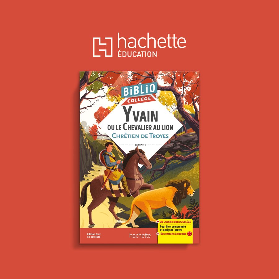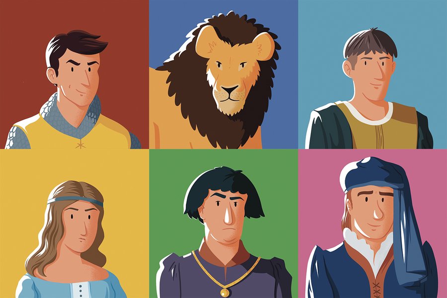 Illustration de la couverture, des doubles-pages et des personnages pour Yvain ou le Chevalier au lion de Chrétien de Troyes.