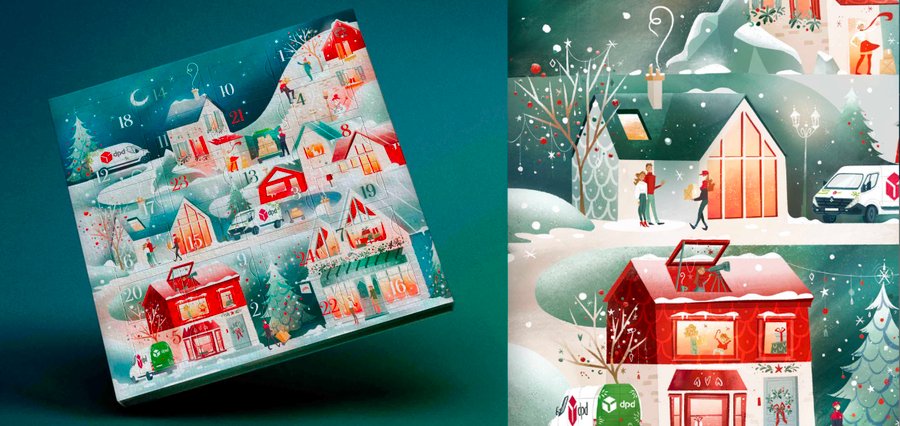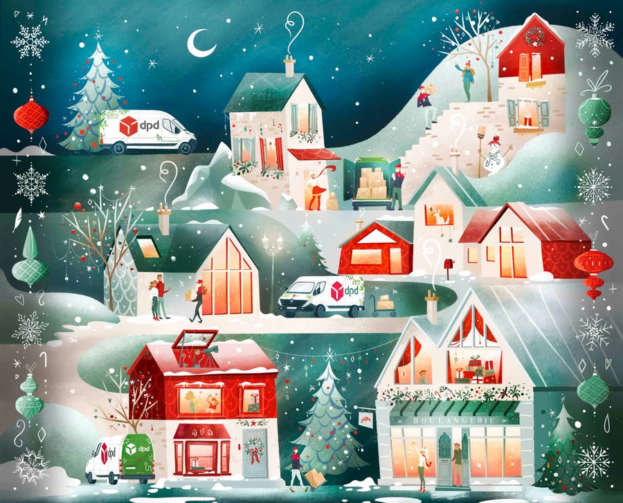 Dans le cadre du projet de calendrier de l'Avent 2020 pour DPD France, nous avons choisi le thème du village de Noël pour susciter une ambiance festive et chaleureuse. J'ai été ravie de collaborer avec l'agence Ponycoco. Mon rôle a été de m'occuper de l'imagination et de la conception du calendrier via Procreate et InDesign.