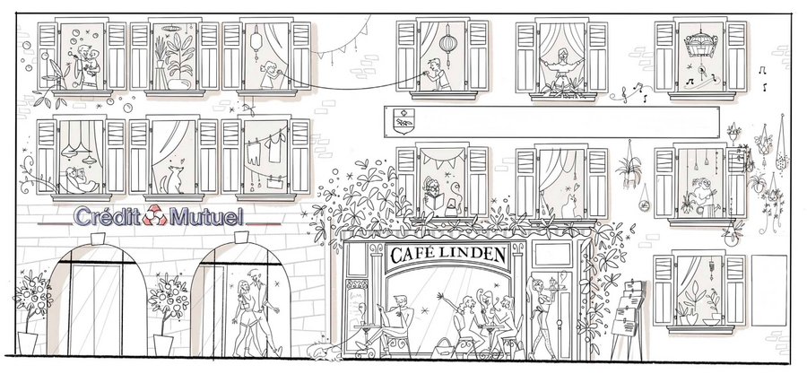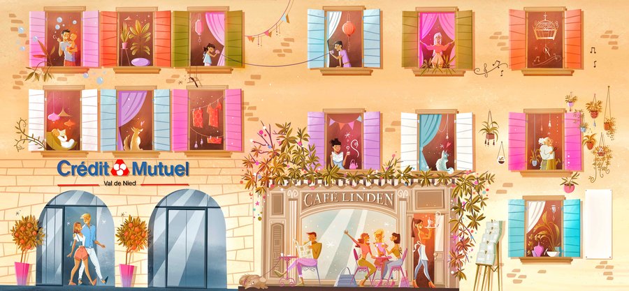 Creation of a life-size illustrated banner for the building, designed to conceal a facade under renovation and enhance the city's aesthetics, as part of a collaboration with Bouzonville and Crédit Agricole.