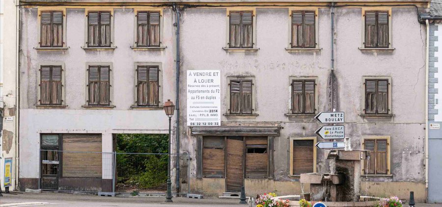 Réalisation d’une bannière illustrée grandeur nature relative à l’immeuble pour cacher une façade en rénovation et embellir la ville, dans le cadre d’une collaboration avec Bouzonville et Crédit Agricole.