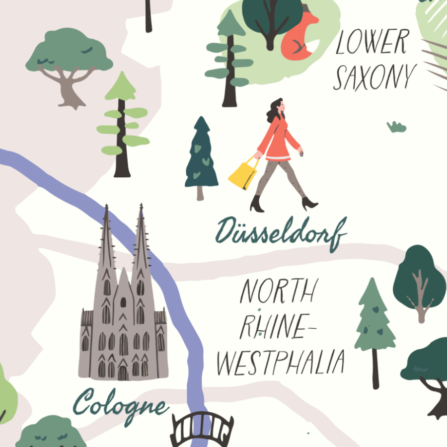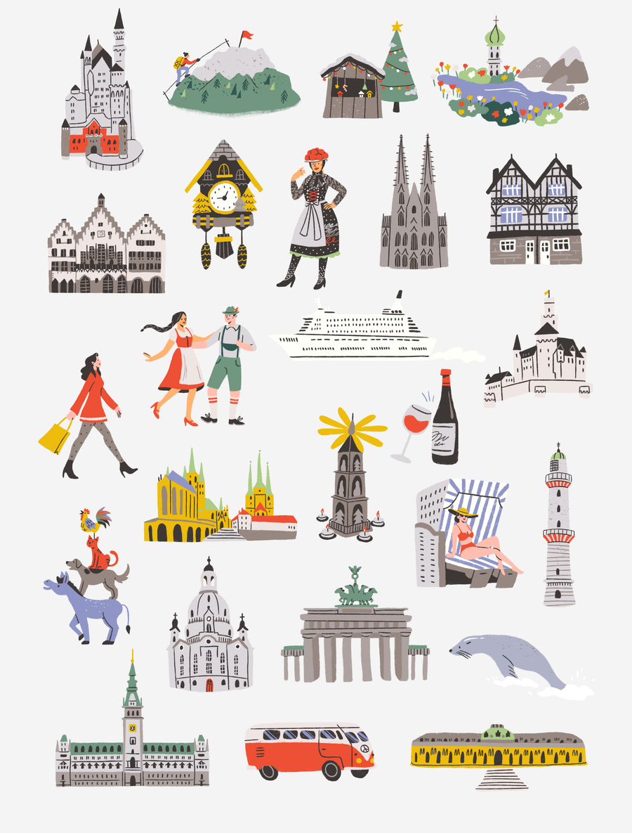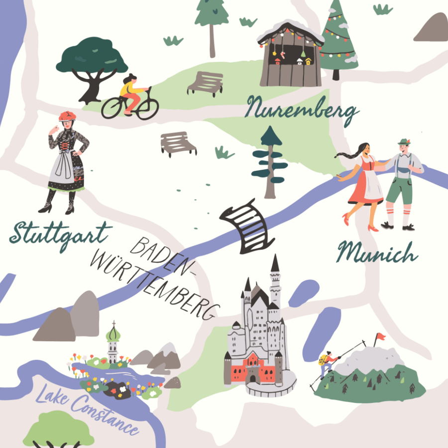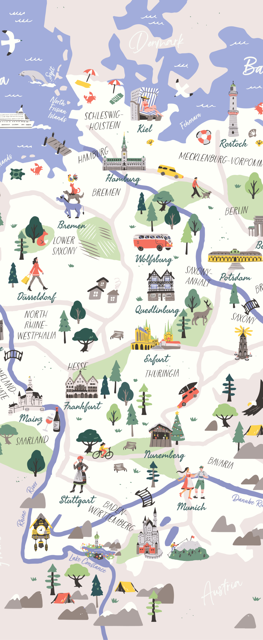 I created a detailed map of Germany with many locations and tradition marks highlighted, which was actively used for various products and souvenirs, bringing pleasant impressions and memories into people's lives.