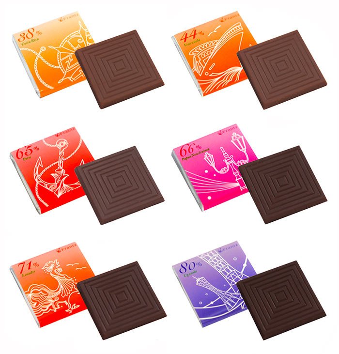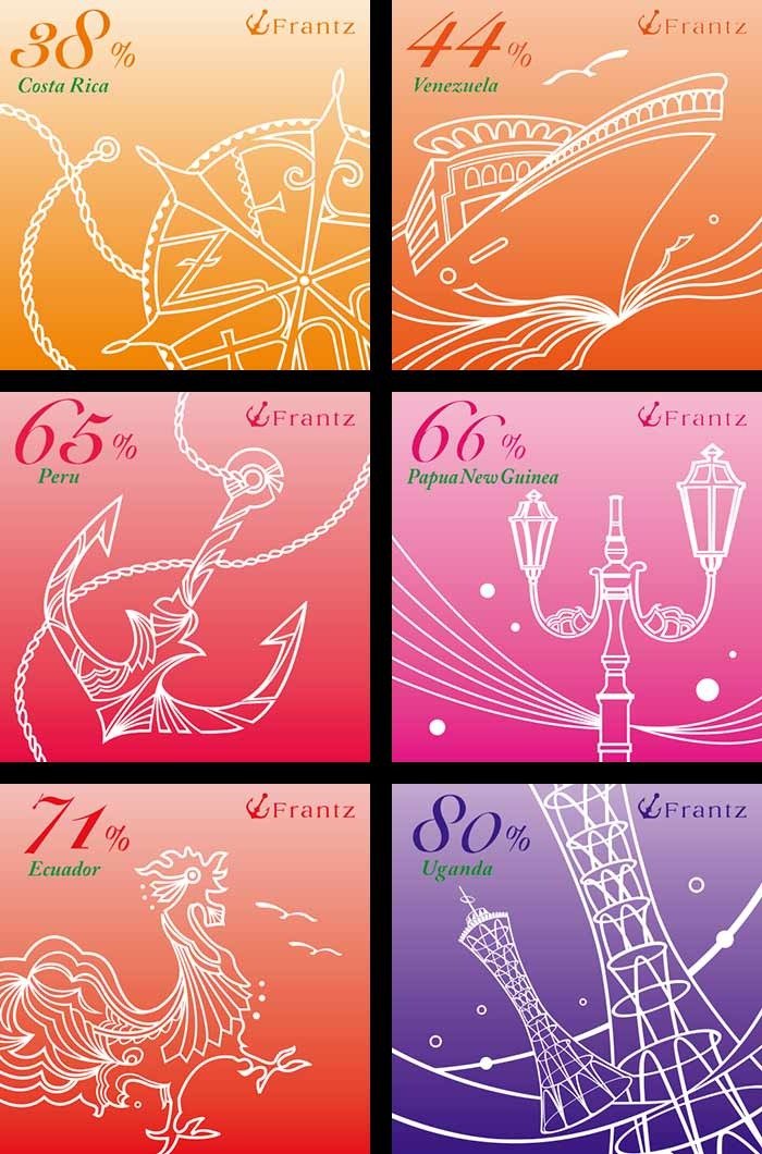 Illustrations pour les carrés de chocolats de la pâtisserie FRANTZ au Japon. La série compte six cacaos du couta Rica, Venezuela, Pérou, Papouasie Nouvelle Guinée, Equateur et Ouganda.