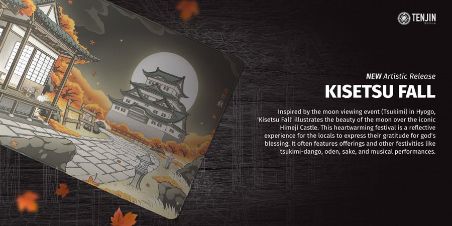 Inspired by the moon viewing event (Tsukimi) in Hyogo, 'Kisetsu Fall' illustrates the beauty of the moon over the iconic Himeji Castle. This heartwarming festival is a reflective experience for the locals to express their gratitude for god's blessing. It often features offerings and other festivities like tsukimi-dango, oden, sake, and musical performances.