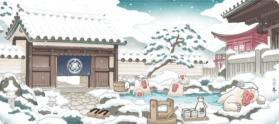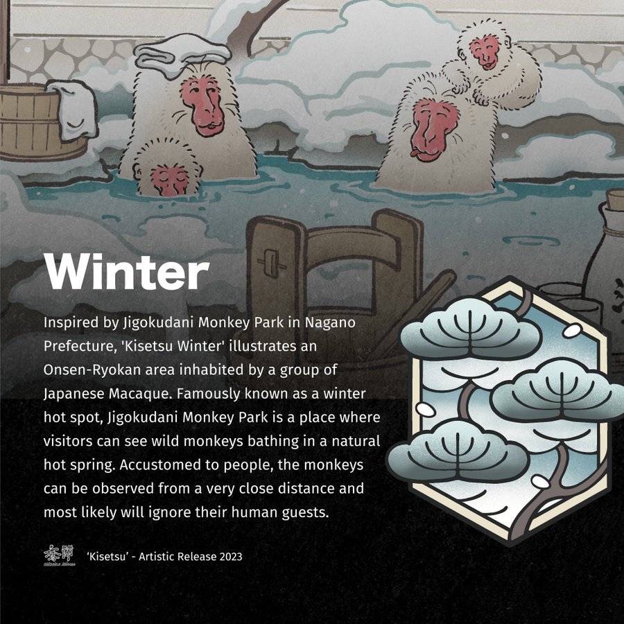Inspired by Jigokudani Monkey Park in Nagano Prefecture, 'Kisetsu Winter' illustrates an Onsen-Ryokan area inhabited by a group of Japanese Macaque. Famously known as a winter hot spot, Jigokudani Monkey Park is a place where visitors can see wild monkeys bathing in a natural hot spring. Accustomed to people, the monkeys can be observed from a very close distance and most likely will ignore their human guests.