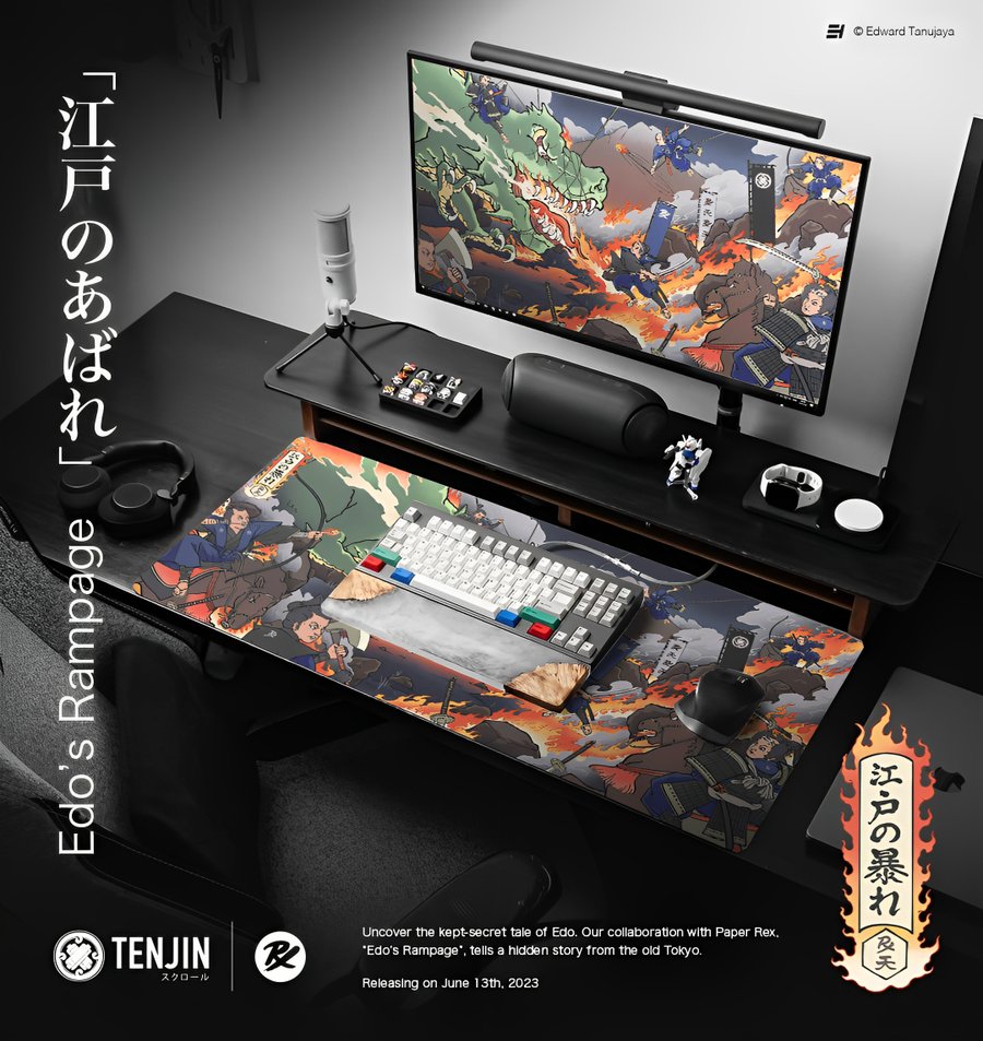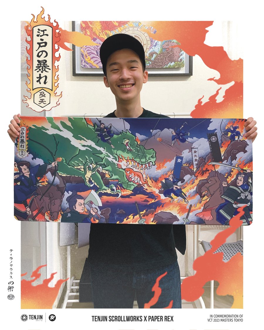 To commemorate Paper Rex Esports' victory and advancement to VALORANT Champions Tour (VCT) Masters in Tokyo, Tenjin Scrollworks is proud to announce the release of an official collaboration deskmat release. Designed by yours truly, the deskmat features a unique concept that fuses the two brands' identities into a never-before-seen work of art.