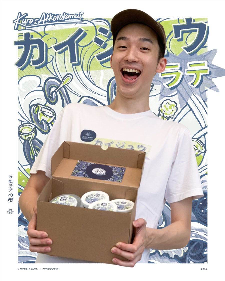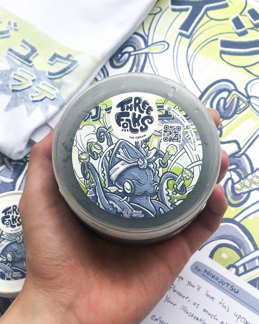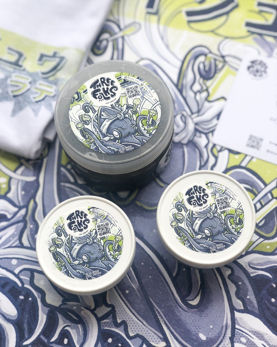 Three Folks Ice Cream & Coffee is a popular café located right in metropolitan areas in Indonesia. To promote their signature charcoal-infused menus, the café partnered with NIKOJUTSU to create a key visual. The visual was applied holistically across several touch points, including promotional posters, take-away and in-store packaging, apparel merchandise, and social media posts.