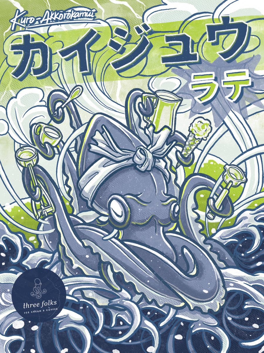 The key visual featured a striking image of a giant black Krakken [アッコロカムイ] holding a scoop of ice cream and a cup of coffee, perfectly capturing the brand's identity. The visual was well-received and helped boosting customer's recollection to Three Folks' charcoal-infused menus.