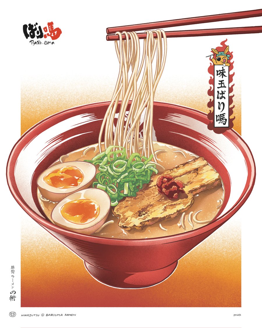 Ajitama-Bariuma 「味玉ばりうま」is the signature Tonkotsu Ramen dish from Bariuma, a renowned ramen chain from Hiroshima, Japan. Springy noodles are accompanied by a flavorful broth, topped with a marinated egg and chashu pork. This heavenly combination is sure to satisfy any noodle connoisseur.