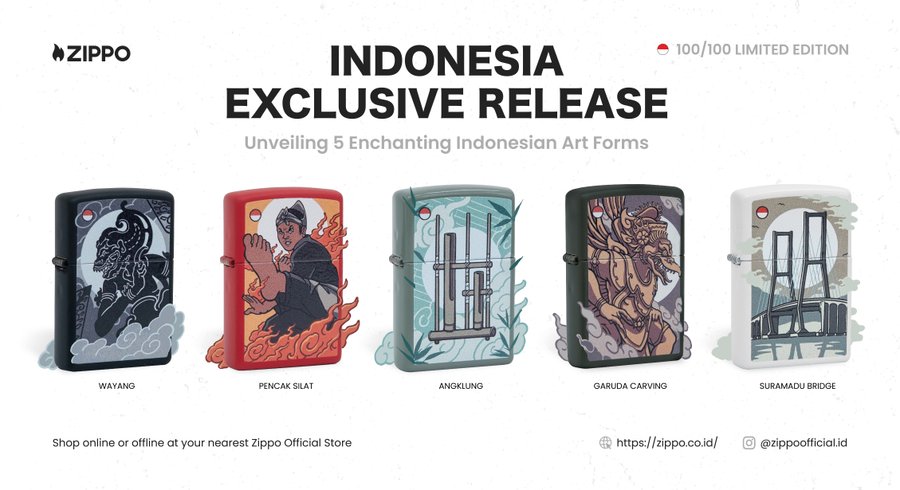Zippo Indonesia ignites passion for heritage with five exquisite lighters, showcasing Nikojutsu's vibrant illustrations of iconic Indonesian arts. Immerse yourself in the rich tapestry of Indonesia with this exclusive Zippo collection. Each lighter, limited to just 100 pieces, celebrates a beloved art form: