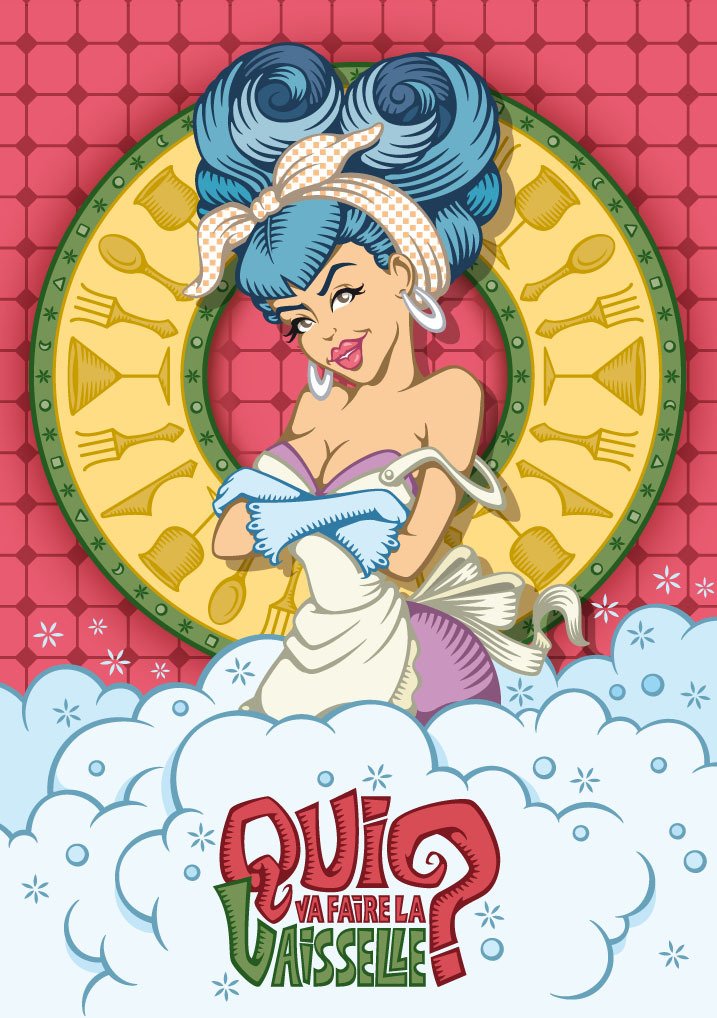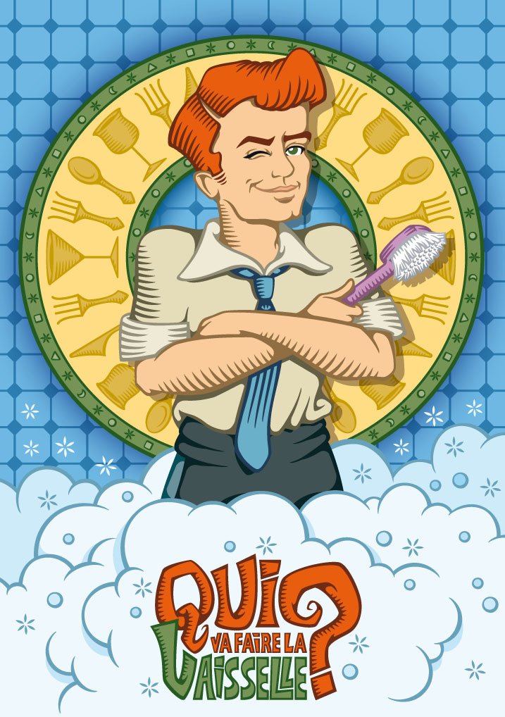 Projet de réadaptation du jeu de plateau "Qui va faire la vaisselle ?"2 facings de boite et une série de 12 cartes.
