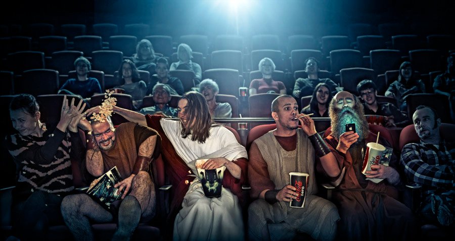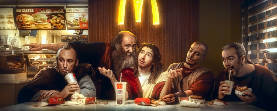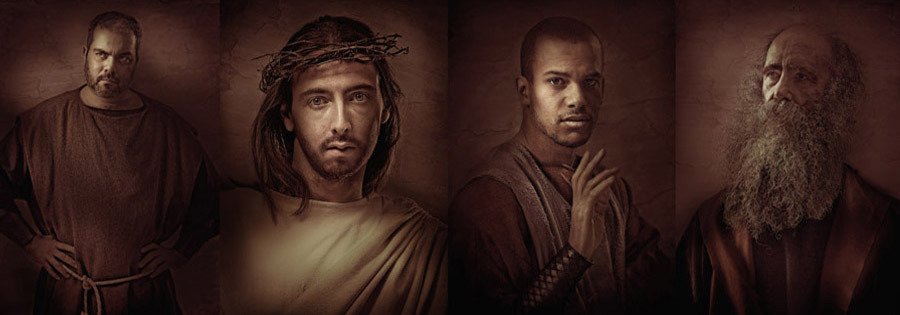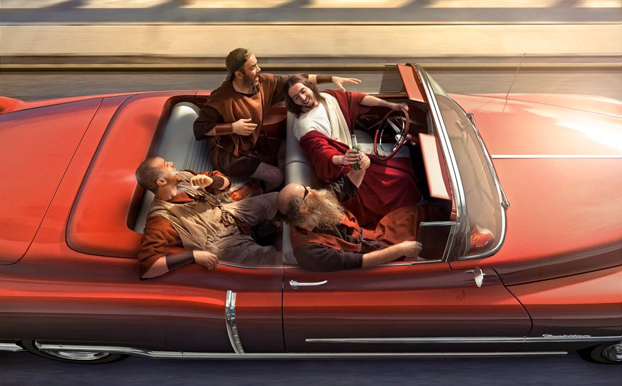 A series of images depicting Jesus and a few of his disciples thrust into the modern era.