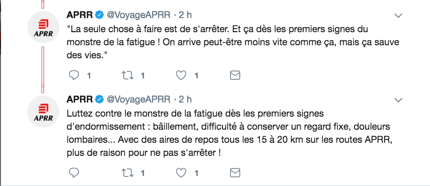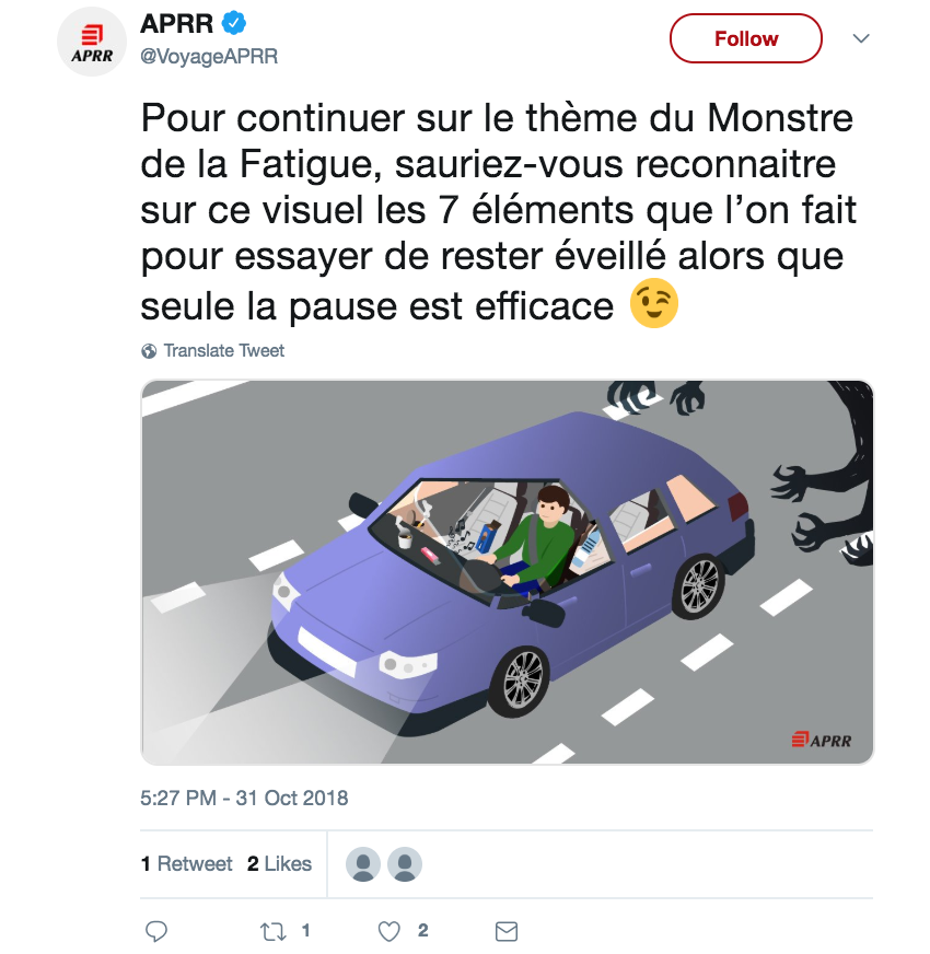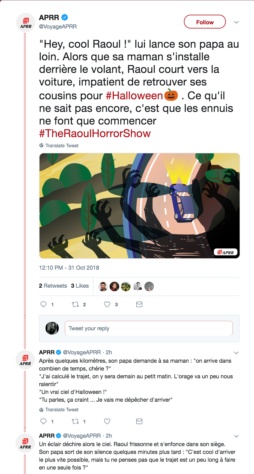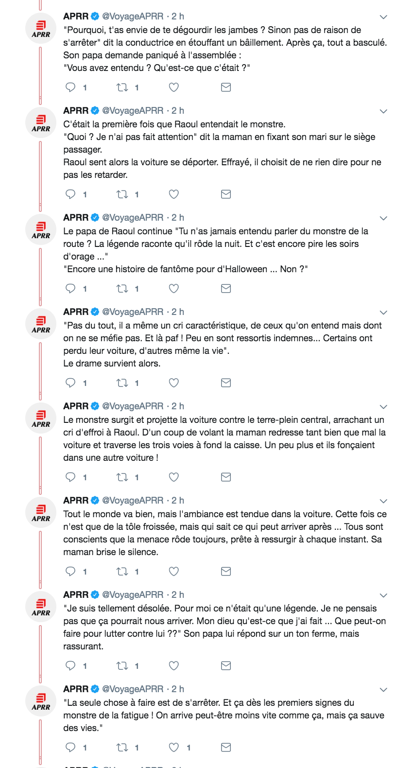 Rédaction d’un conte d’Halloween sous forme de thread Twitter. Un enfant est poursuivi par un mystérieux monstre (spoil), à la fin du conte on découvre que ce danger est en fait la fatigue du conducteur. Les # mettent en exergue le nom d’aires d’autoroutes APRR où s’arrêter pour rester #CoolRaoul. ​