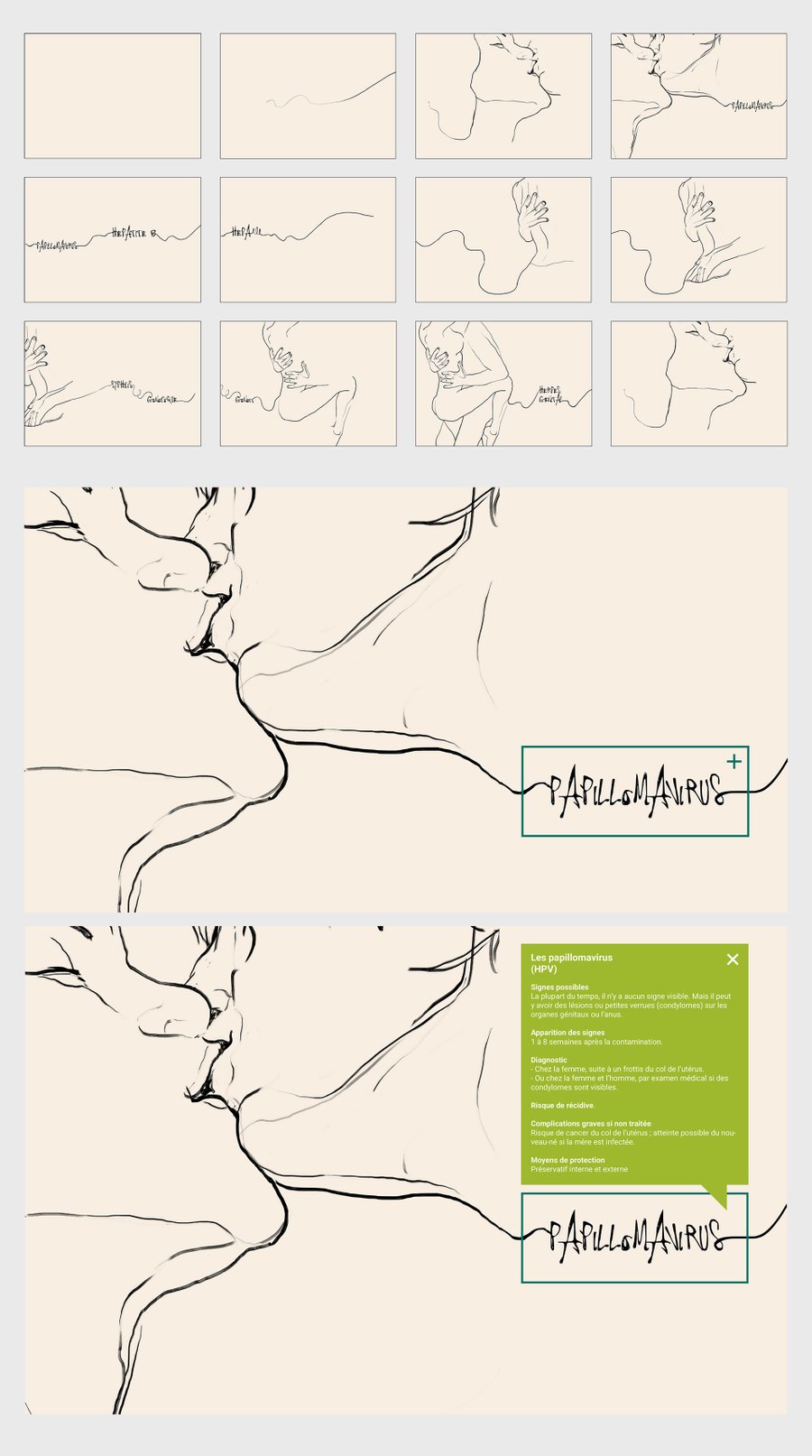 Le traité illustratif utilisé a pour but de pouvoir montrer des images « crues », directes, de façon plus douce et plus discrète qu’un traitement photo. De plus, il permet de s’adresser à une plus grande cible puisque ce traité au trait, sans couleur, évacue la question de l’origine sociale et culturelle.