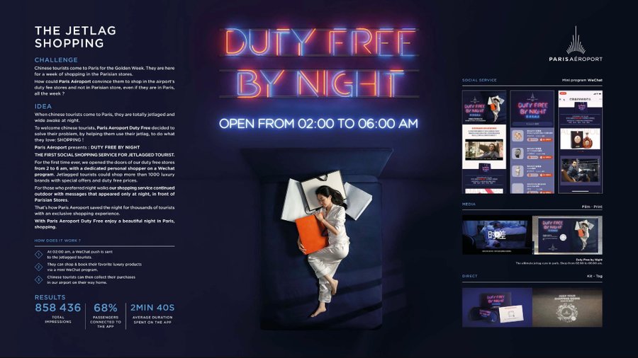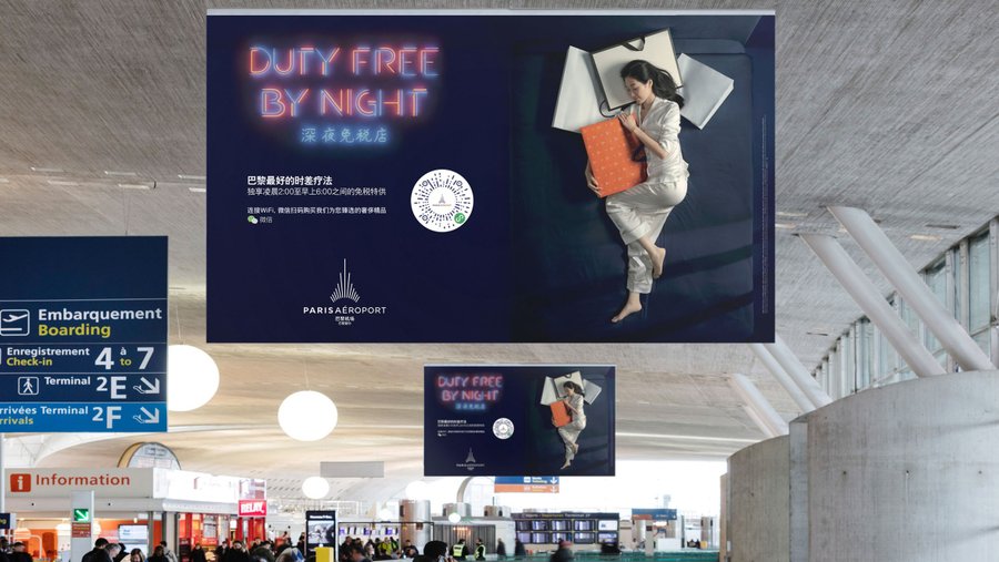 Lorsque les touristes chinois viennent à Paris, ils sont totalement en décalage horaire et bien éveillés la nuit. Pour accueillir les touristes chinois, Paris Aéroport Duty Free a décidé de résoudre leur problème, en les aidant à profiter de leur décalage horaire, pour faire ce qu'ils aiment :