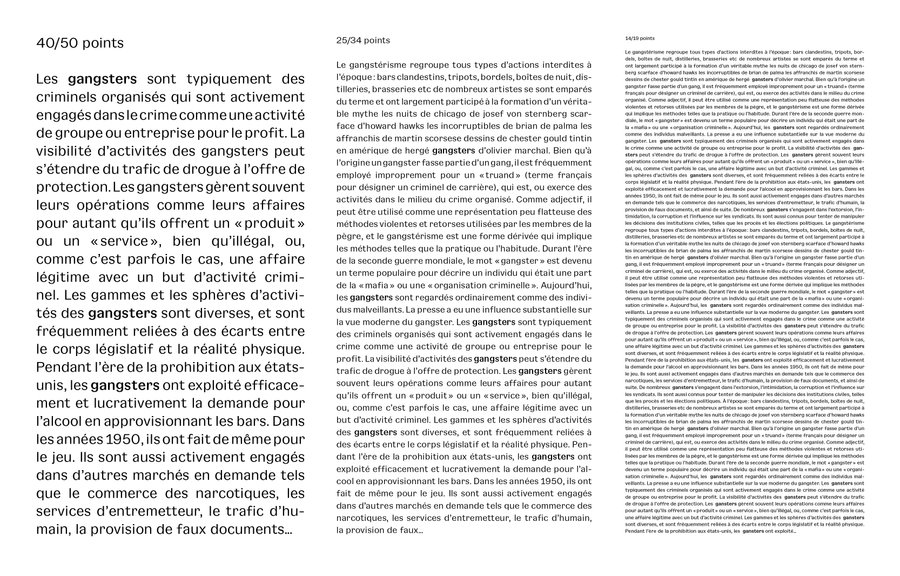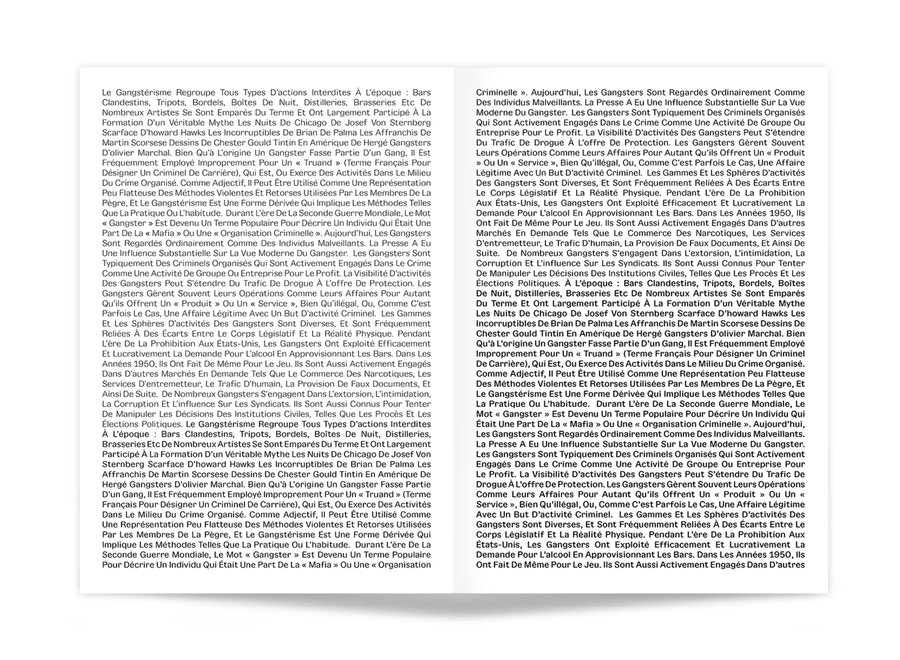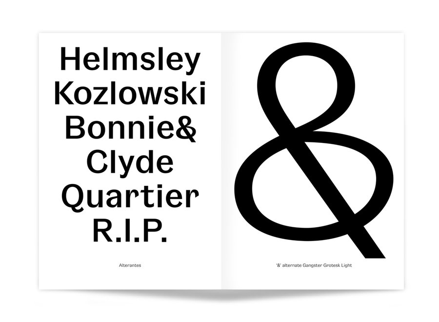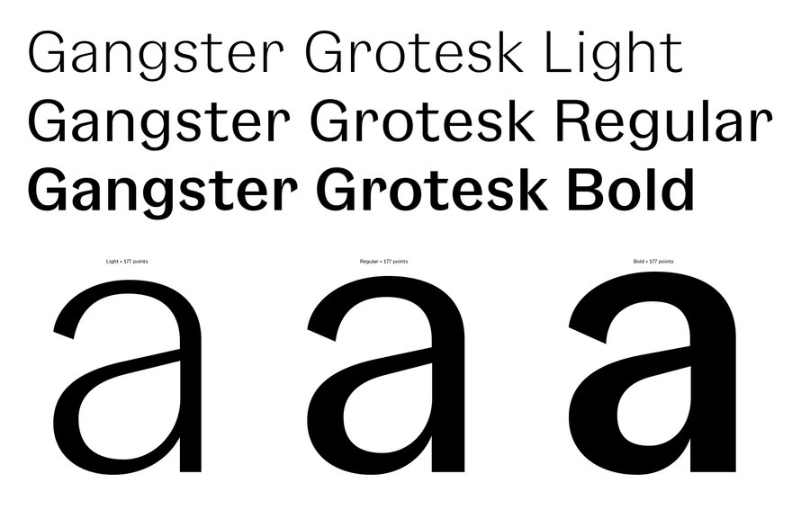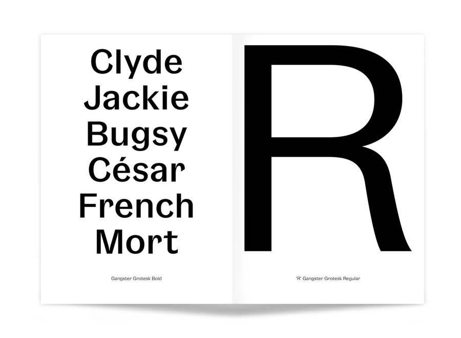 Inspirée des premières "grotesques" des années 1920, Gangster Grotesk est une police de caractères contemporaine qui associe un contraste entre pleins et déliés et des terminaisons fermées. Ces caractéristiques sont simples, reconnaissables et efficaces, prêtant à cette police de caractères un charme prenant toute son ampleur en grande taille et presque invisibles en petites tailles.