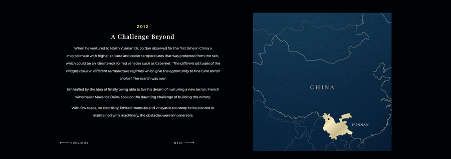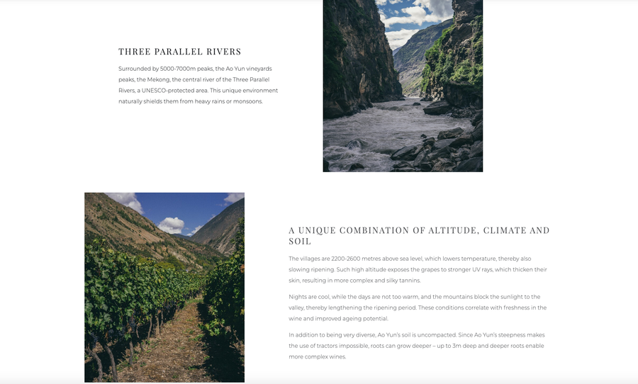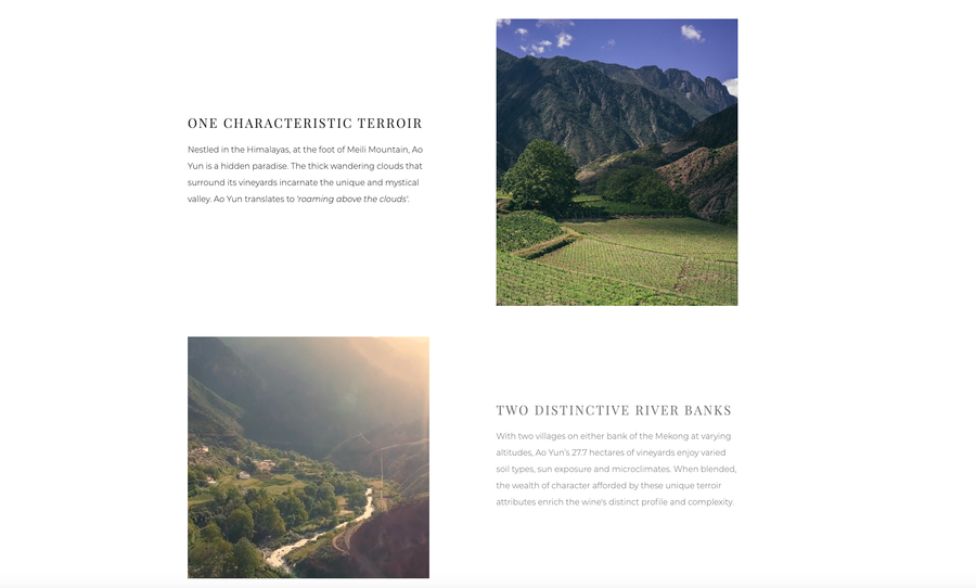 "Nestled in the Himalayas, at the foot of Meili Mountain, Ao Yun is a hidden paradise. The thick wandering clouds that surround the vineyards characterise the unique and mystical valley. Locally, Ao Yun means 'roaming above the clouds'."