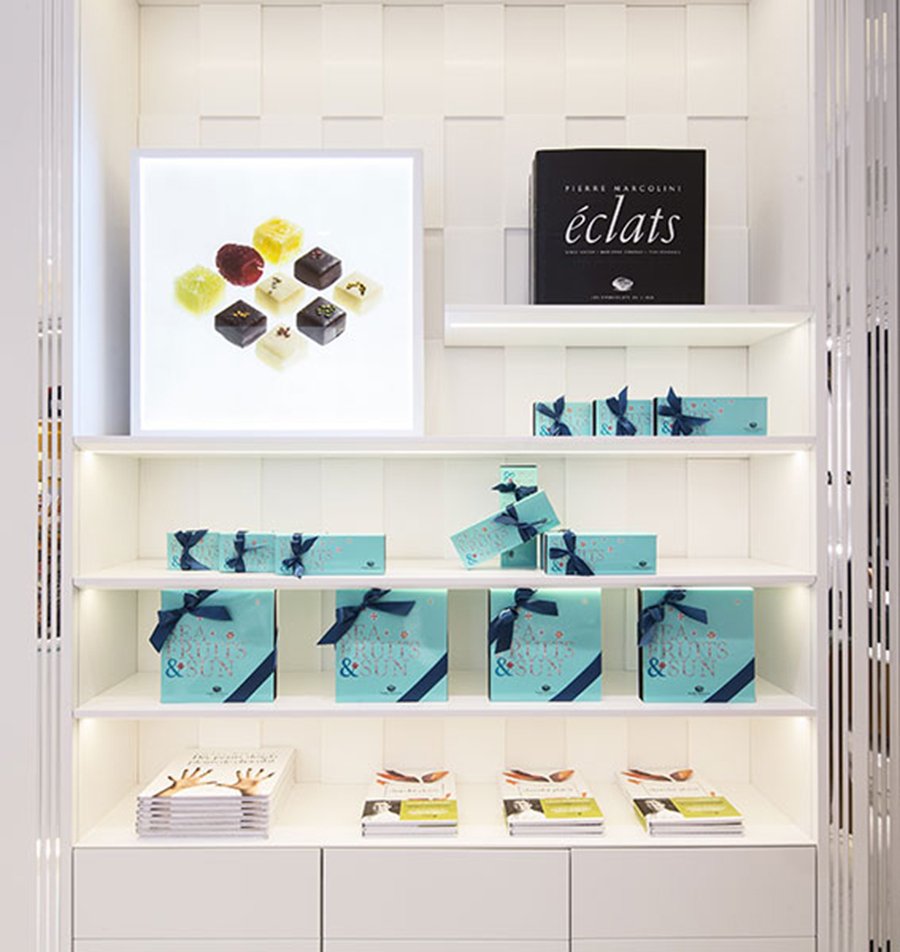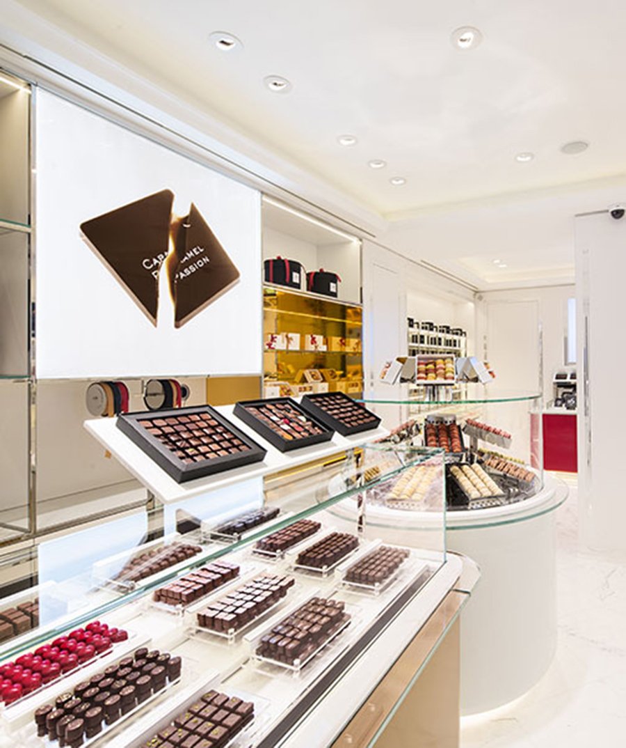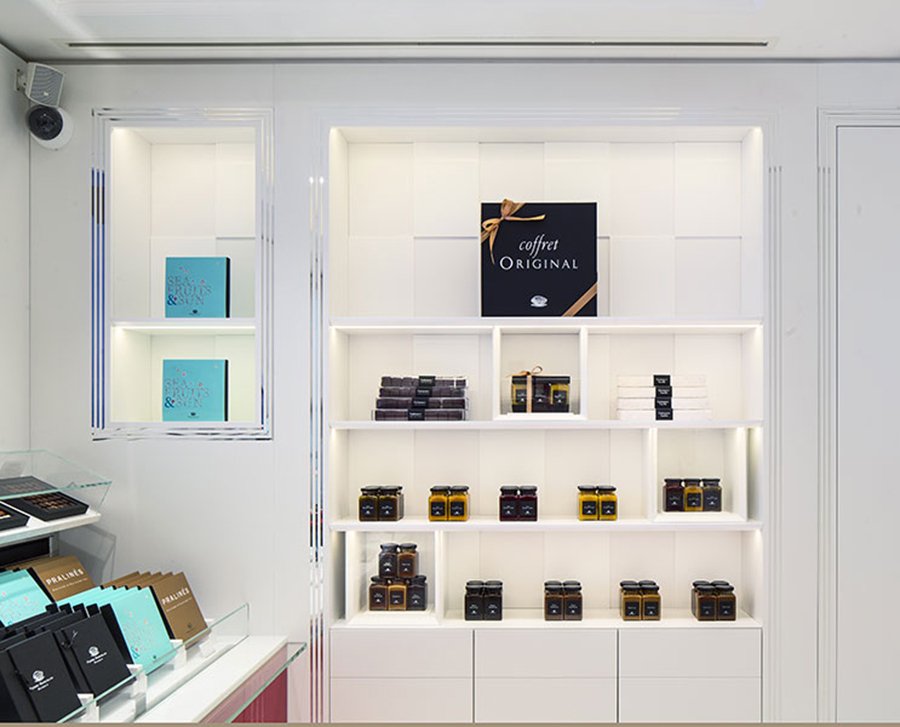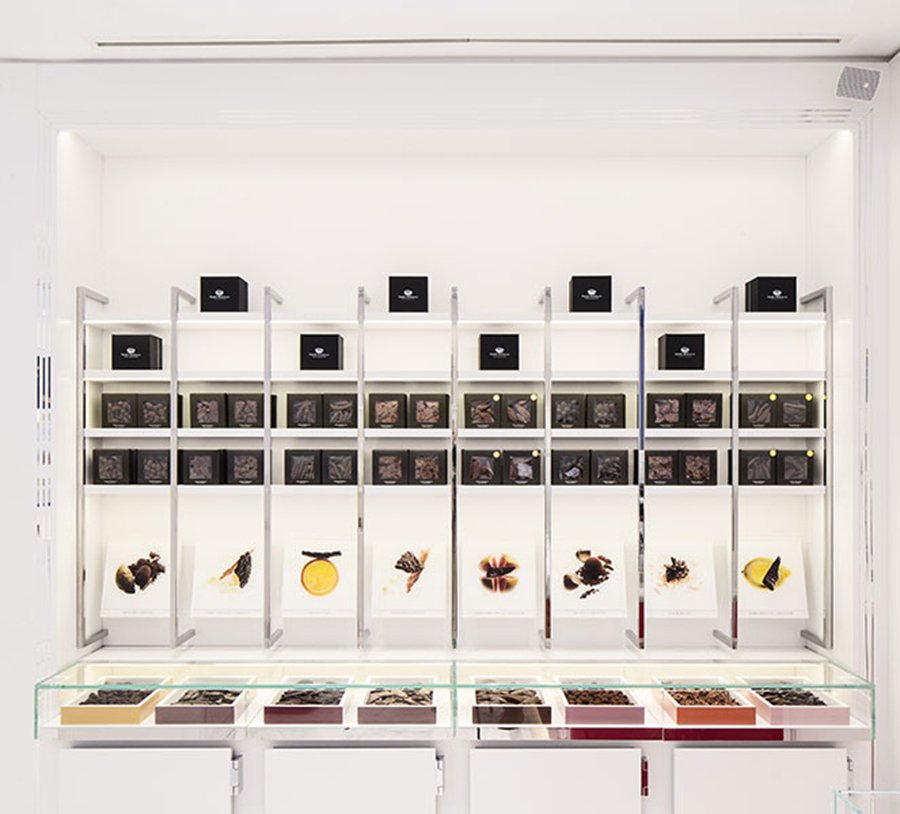 Cette première boutique de 52m2 rue St Honoré à Paris, développe le travail entreprit avec Pierre Marcolini. Les meubles colorés et ludiques prennent place dans une enveloppe à dominante de blanc et réhaussée de poly-miroir, qui contraste avec le noir des packagings. Chaque dégustation y est soigneusement mise en scène, comme avec le carrousel à macarons où le bar à pralines. Crédit éclairage : INTO Lighting