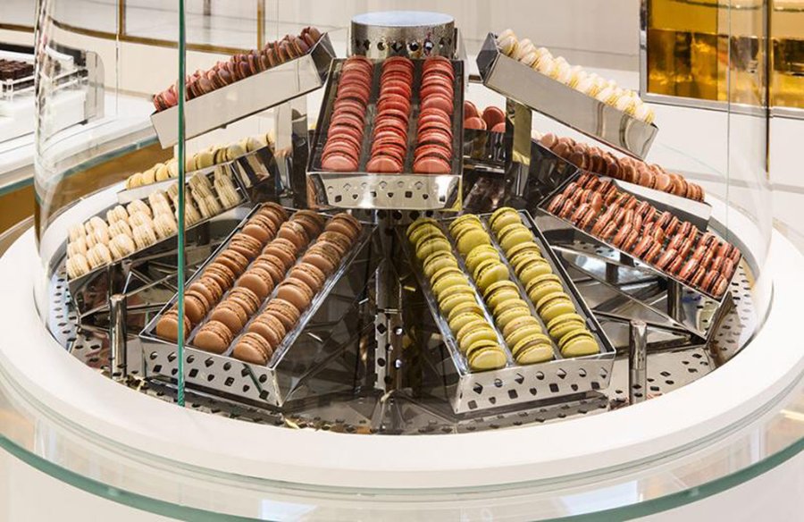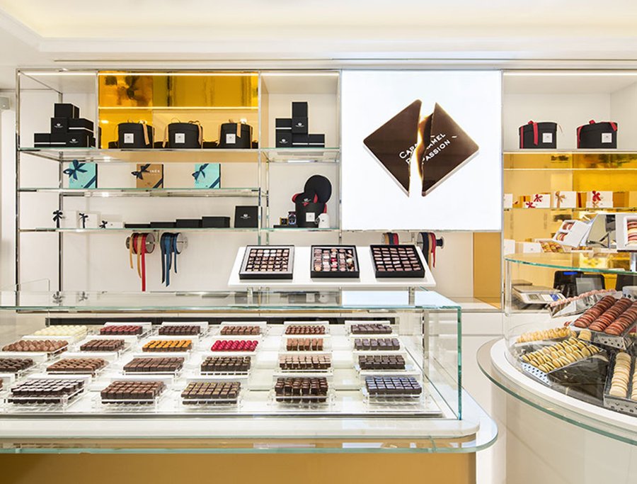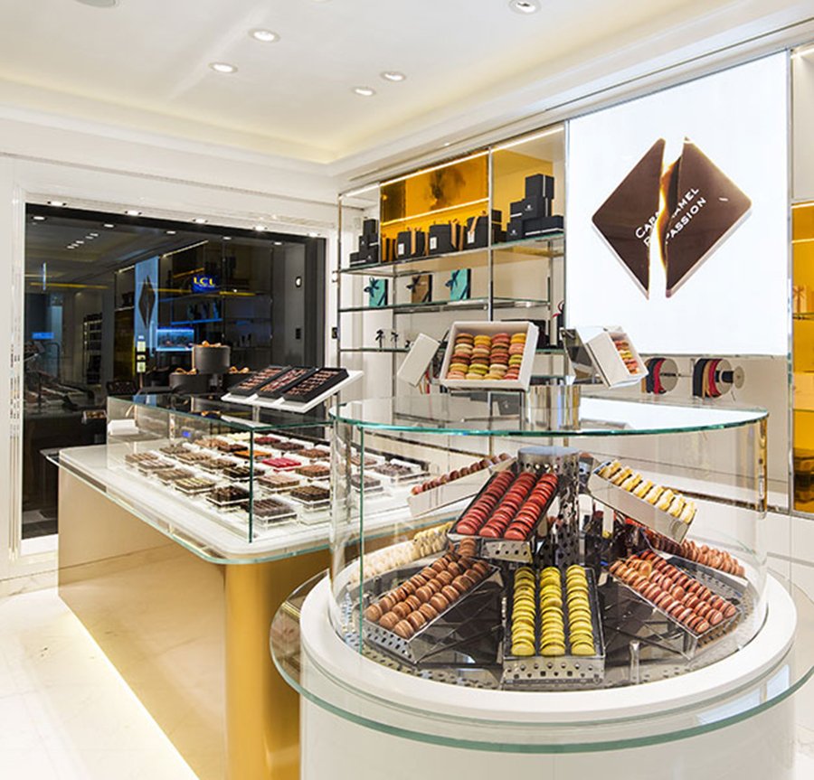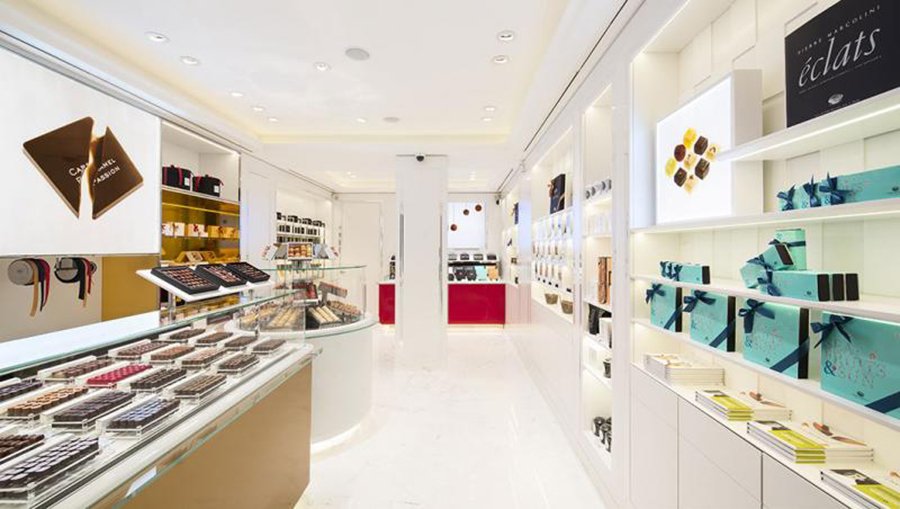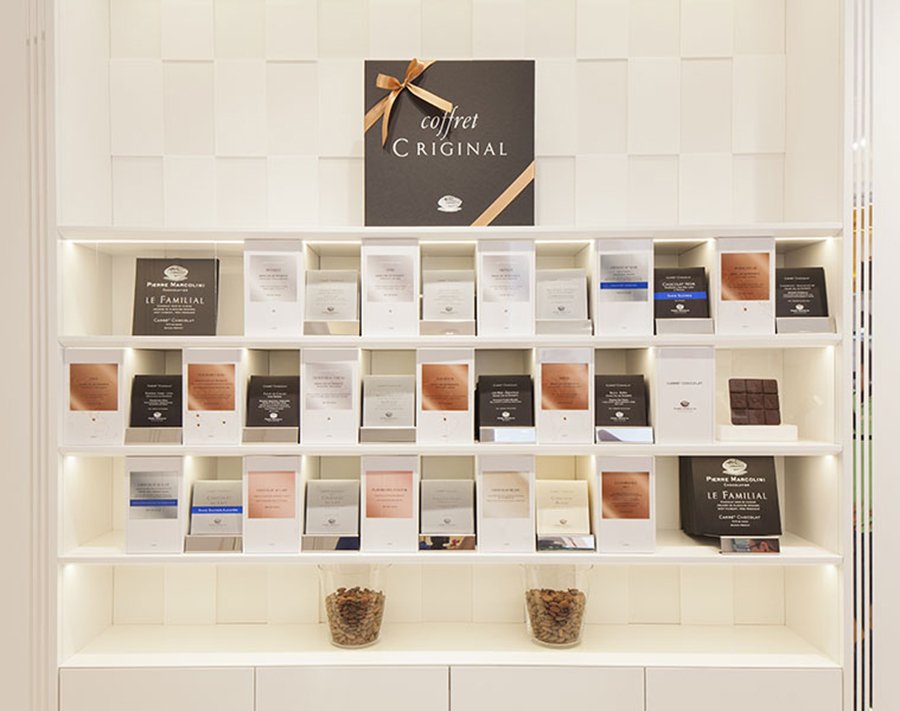 Cette première boutique de 52m2 rue St Honoré à Paris, développe le travail entreprit avec Pierre Marcolini. Les meubles colorés et ludiques prennent place dans une enveloppe à dominante de blanc et réhaussée de poly-miroir, qui contraste avec le noir des packagings. Chaque dégustation y est soigneusement mise en scène, comme avec le carrousel à macarons où le bar à pralines. Crédit éclairage : INTO Lighting