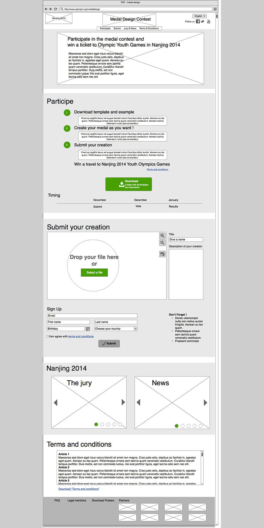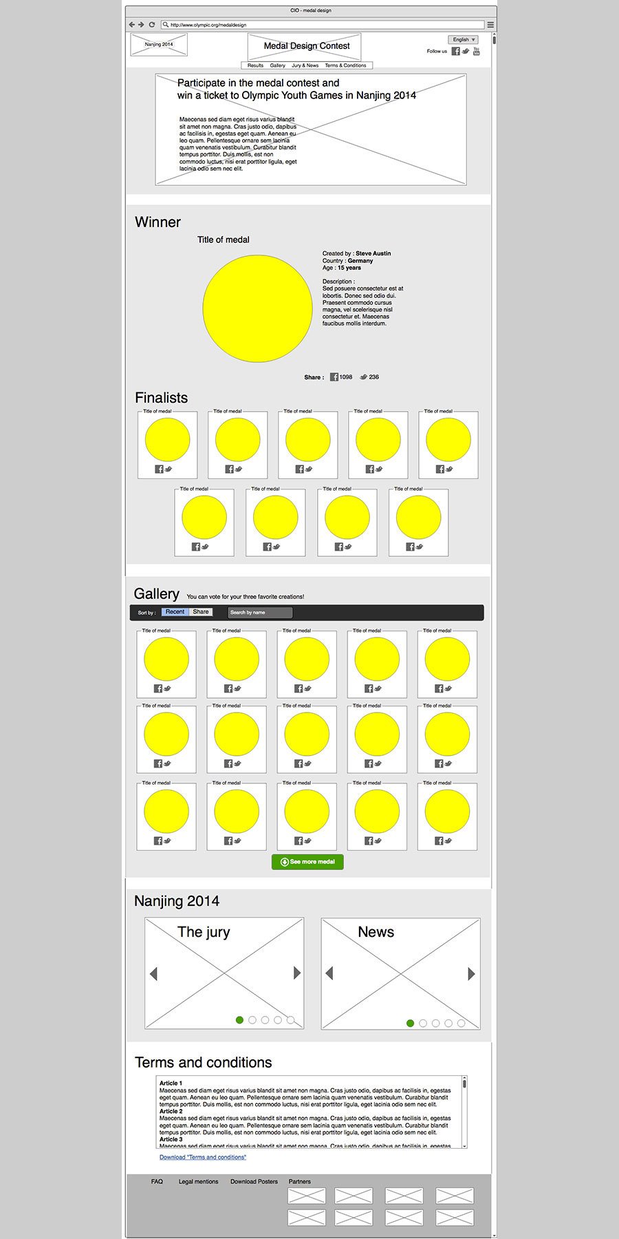 Création d'un concours pour le CIO. Le but du concours est la création d'une médaille. Il a fallut penser à un processus d'apparence simple pour permettre à tous de participer. Les wireframes réalisées initialement ont permis d'être retenu lors de l'appel d'offres. Il a fallut en suite affiner le concept et le décrire précisément pour la réalisation.