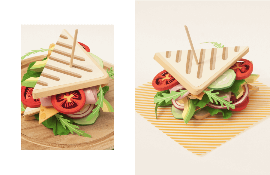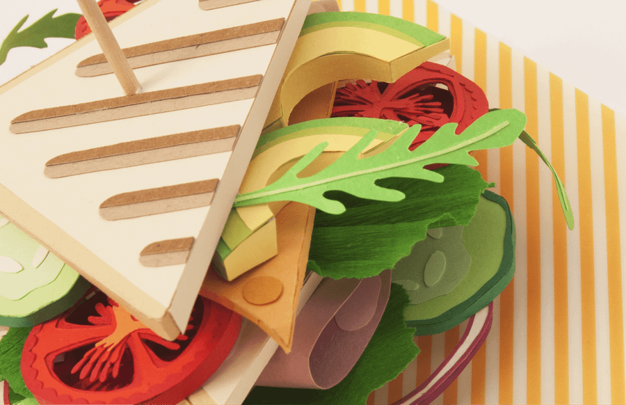 Have a break, have a sandwich ! Qui ne pourrait pas saliver devant cette tomate ou ces tranches d'avocats ! J'ai pris du plaisir à créer ce paper art et découper tous ces détails fascinants, de la feuille de roquette aux tranches de pain grillés ! et Maintenant, à table !