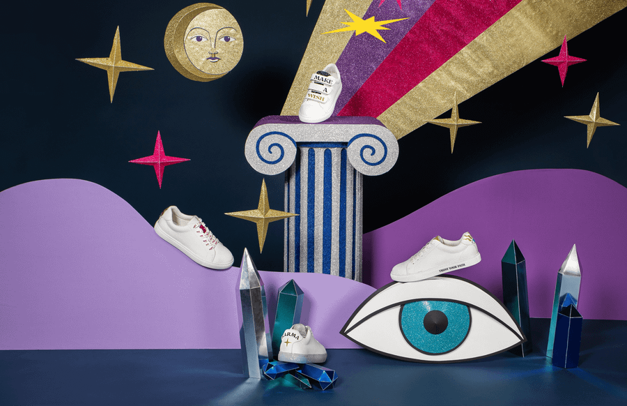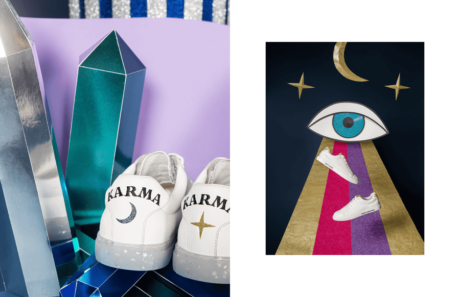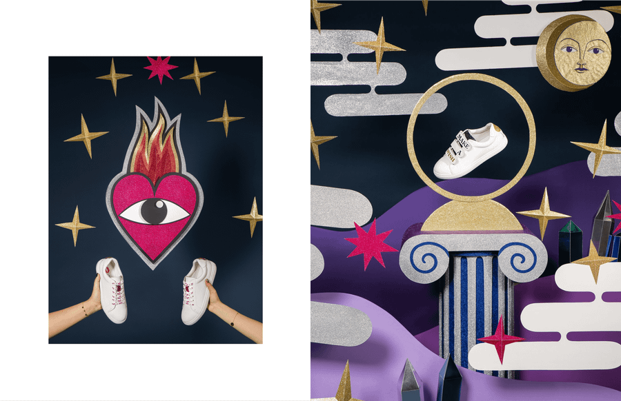 Pour leur collection “Karma”, en collaboration avec l’artiste et tarologue Caroline Drogo, j’ai réalisé un set design en papier, mystique et pailleté qui met en scène plusieurs modèles de chaussures.